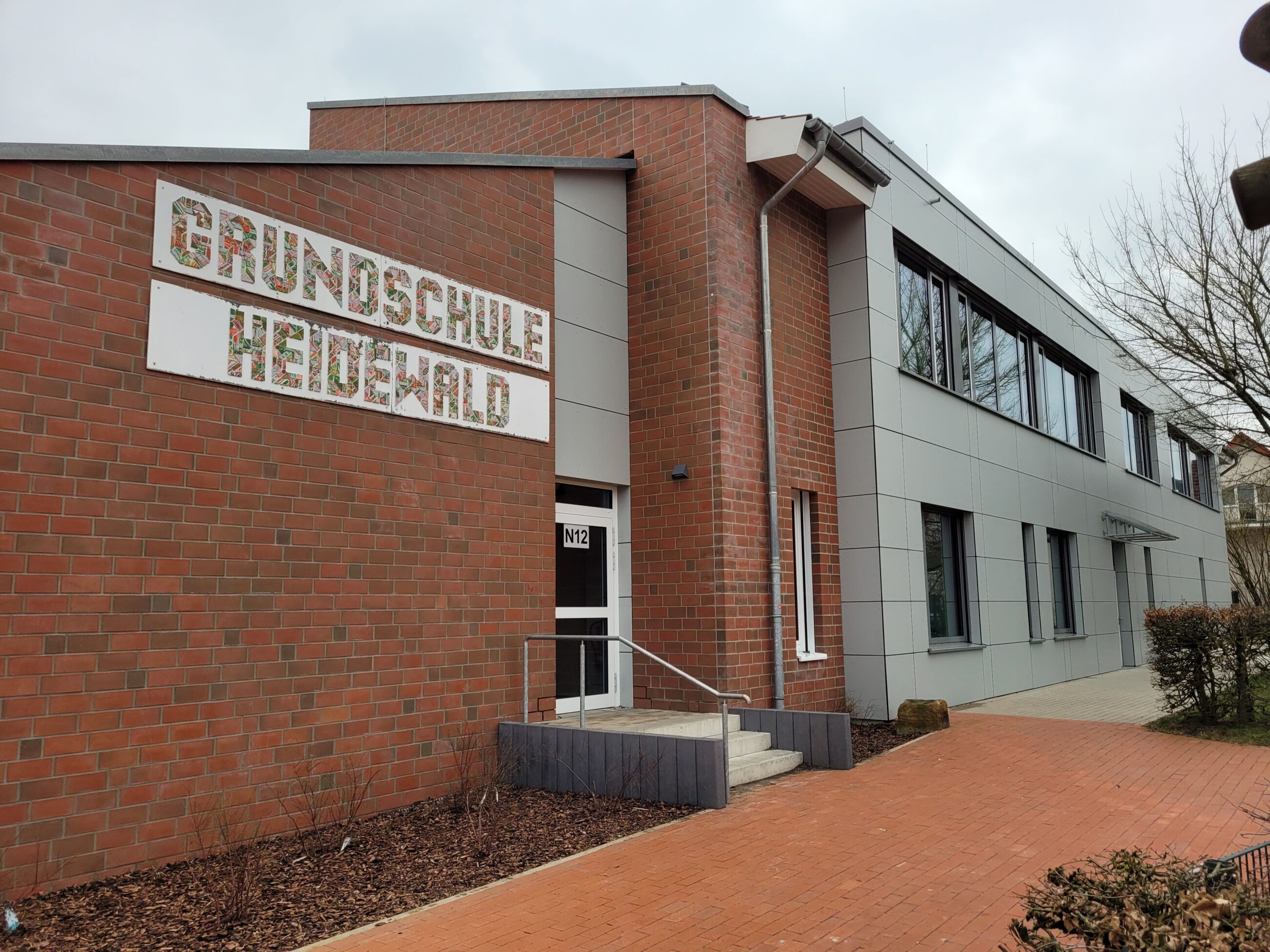 An dem neuen Gebäudeteil prangt der Name der Grundschule in bunten Buchstaben: Grundschule Heidewald. Foto: Stadt Gütersloh