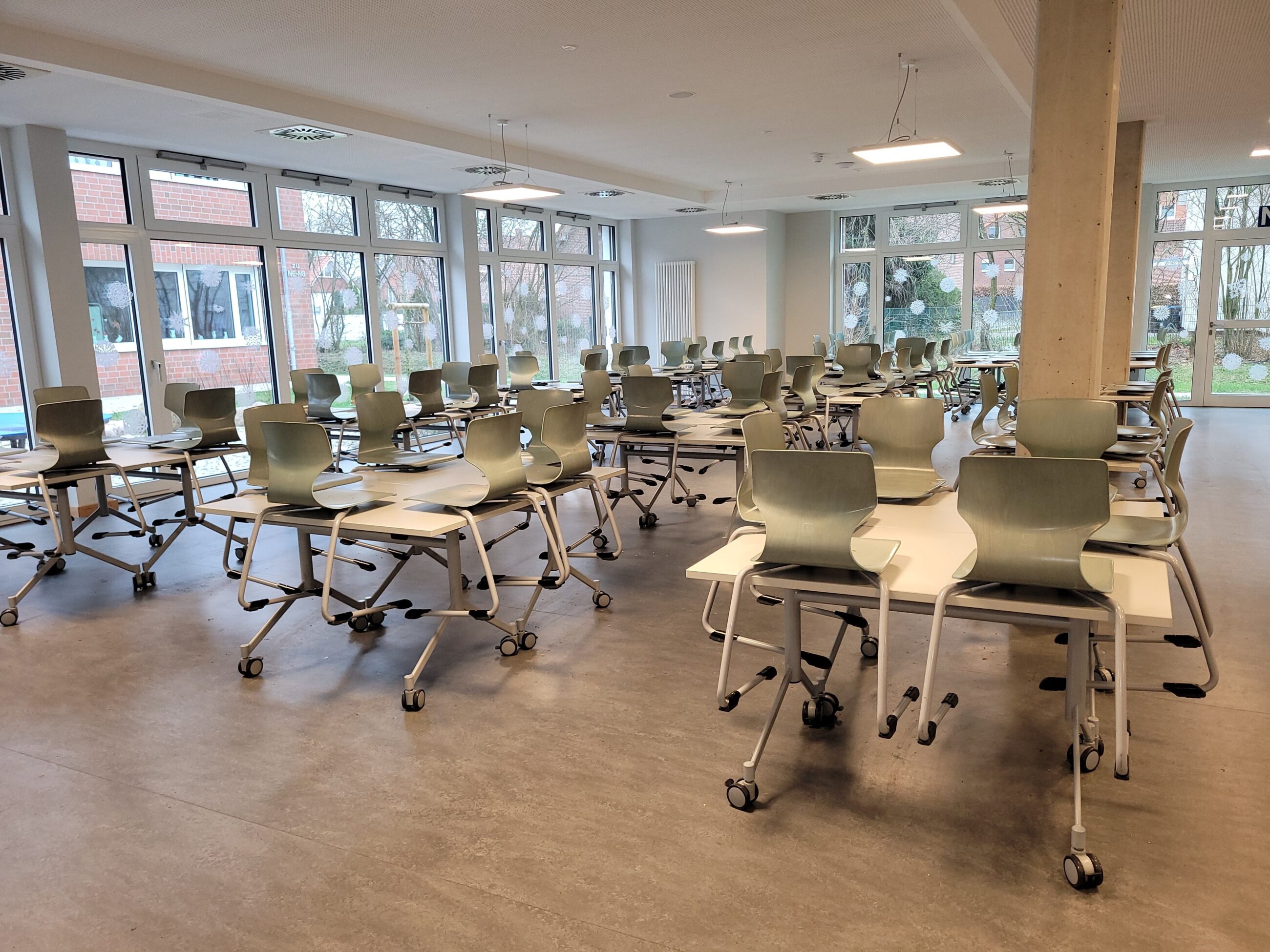 Die eigentlichen Bauarbeiten erfolgten von Frühjahr 2021 bis Frühjahr 2023, wobei die besondere Herausforderung darin bestand, den laufenden Schulbetrieb so wenig wie möglich zu beeinträchtigen. Nun sind auch die Außenanlagen fertig und alle Räume der Schule ausgestattet.