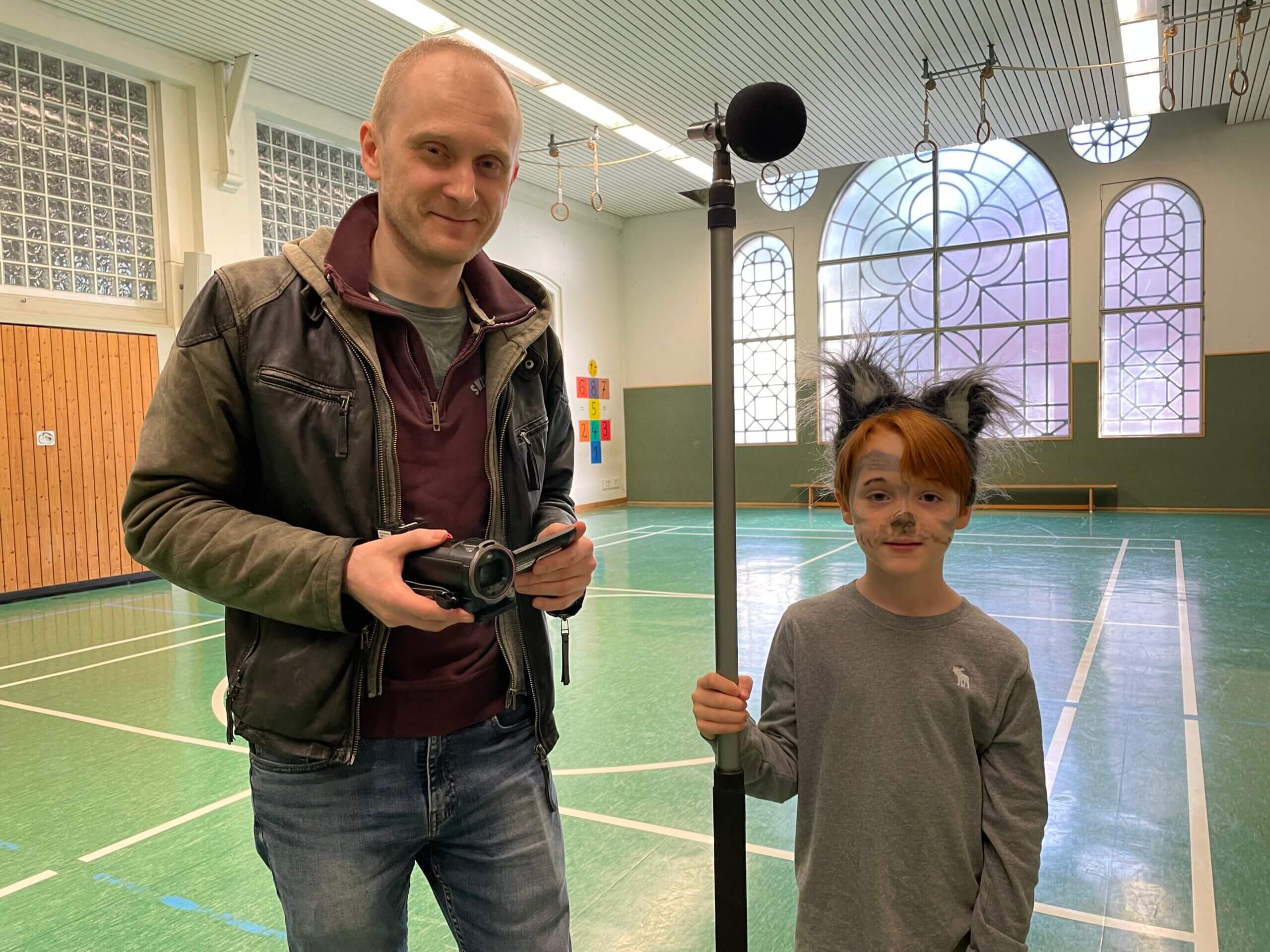 Paul aus der 2a spielt im Film einen Wolf. In den Szenen, in denen er nicht zu sehen ist, hält er das Mikrofon und unterstützt so den Medienpädagogen Juri Kröker beim Ton. Foto: Kreis Gütersloh