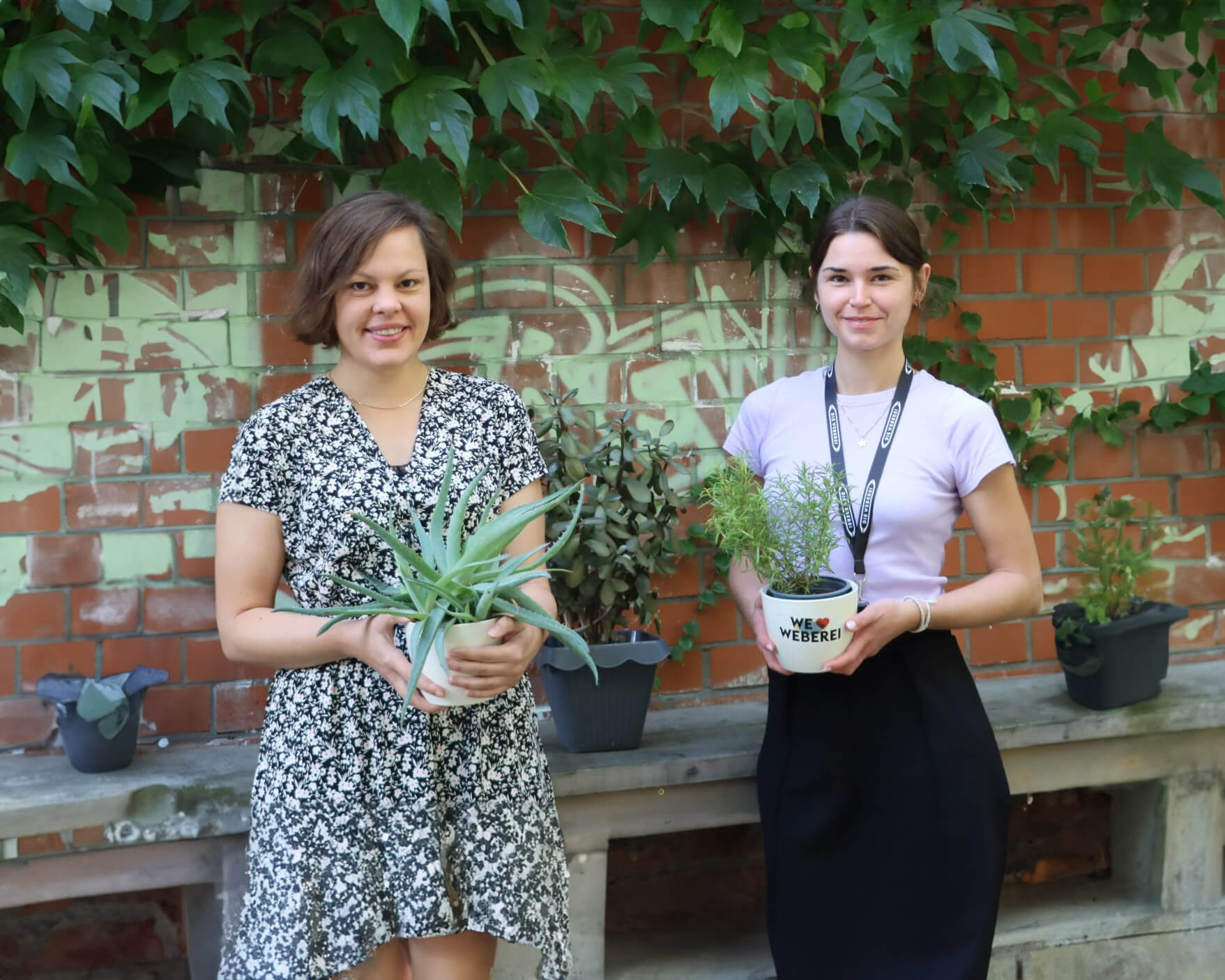 von links: Jana Felmet und Laura Seppmann aus dem Weberei-Team freuen sich auf einen regen Tausch von Pflanzgut auf der Weberei-Terrasse