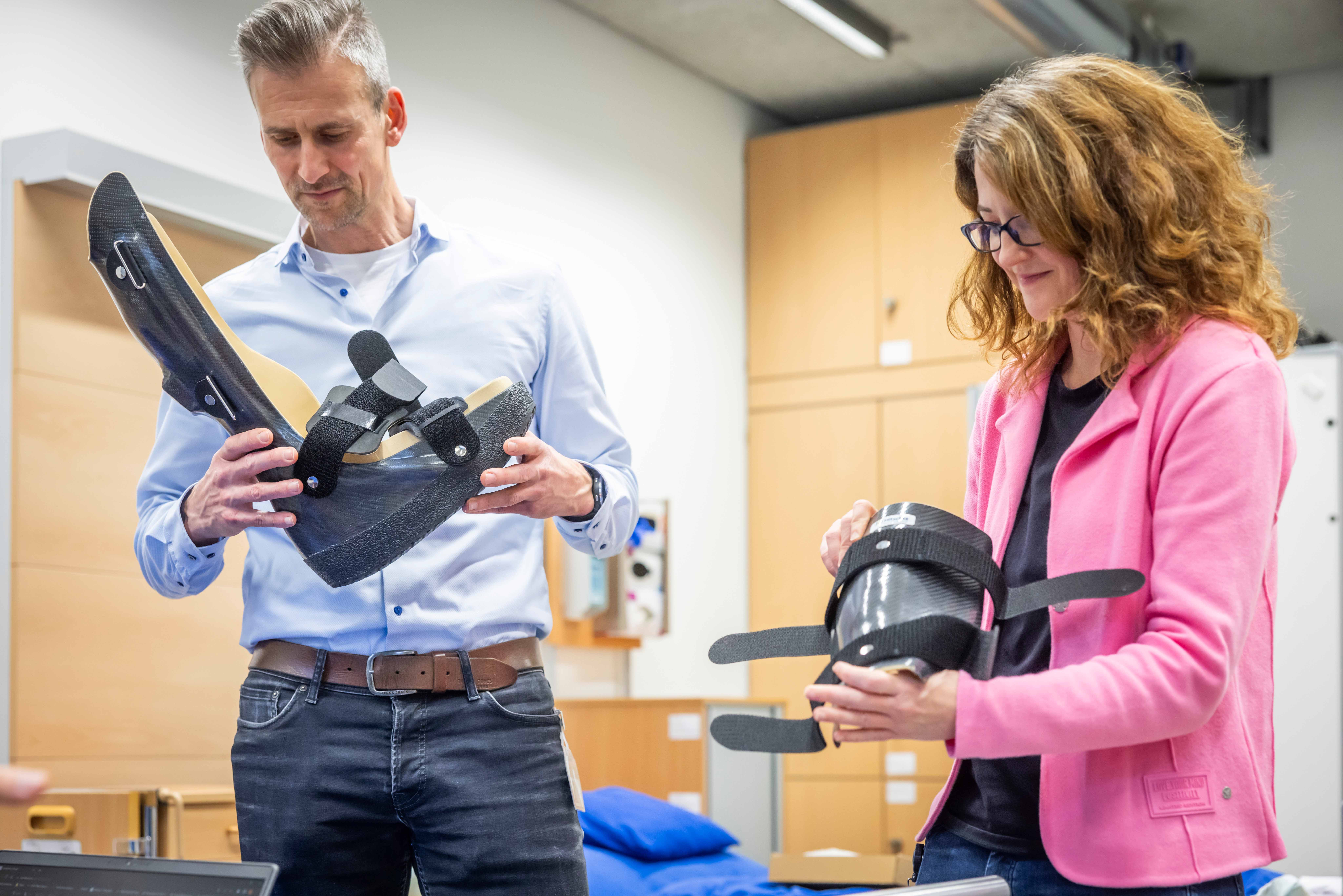 Ein Ingenieur und eine Physiotherapeutin testen die schlaue Orthese