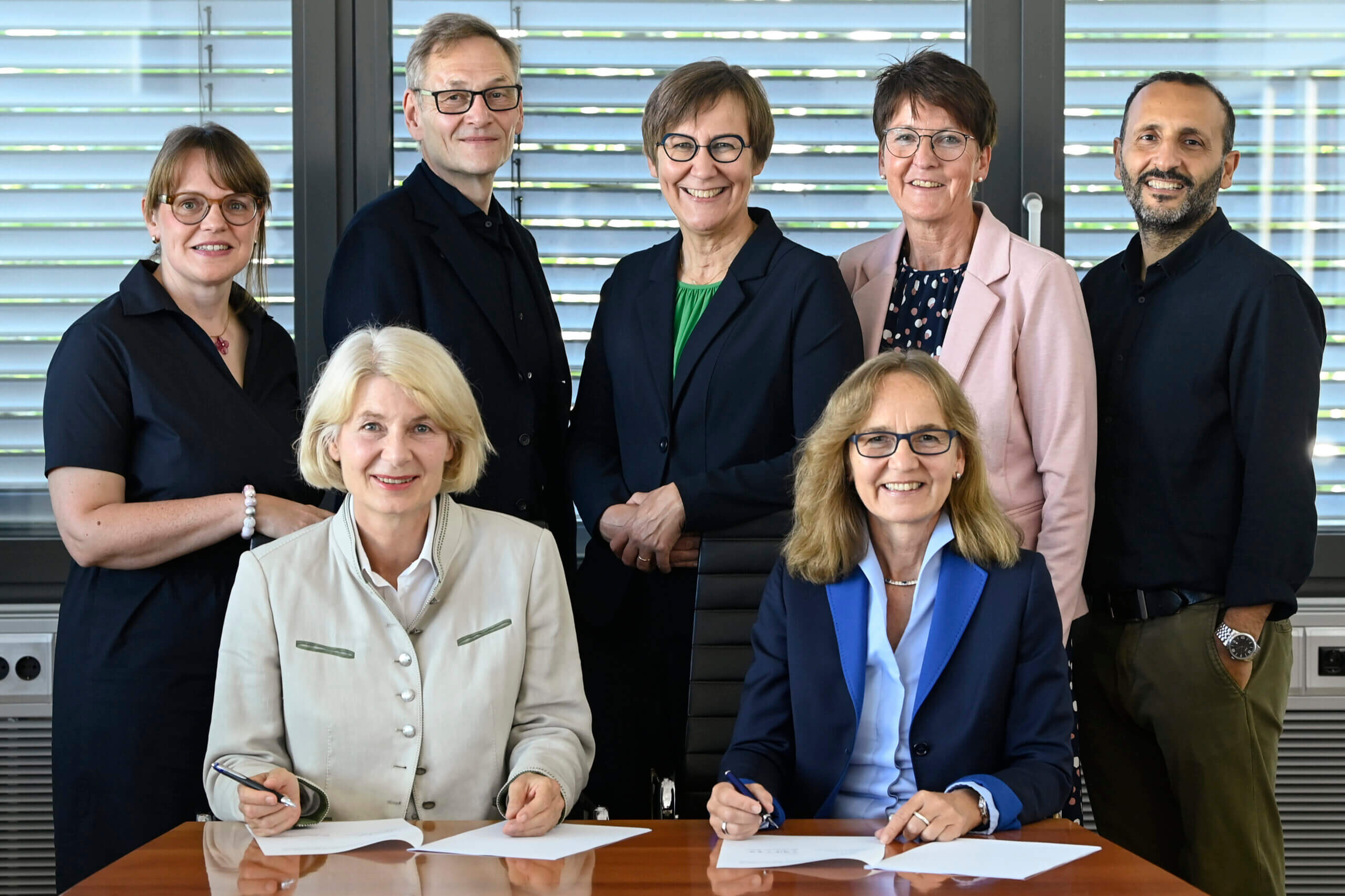Vertragsunterzeichnung: Vordere Reihe (v.l.n.r.): Prof. Dr. Ingeborg Schramm-Wölk (Präsidentin der HSBI), Dipl.-Germ. Petra Pigerl-Radtke (Hauptgeschäftsführerin IHK Ostwestfalen zu Bielefeld); hintere Reihe: Prof. Dr. Anita Eusterbrock (HSBI), Prof. Dr. Hermann Jahnke (Universität Bielefeld, Dipl-Kffr. Ute Horstkötter-Starke (Geschäftsführerin IHK Ostwestfalen zu Bielefeld/IHK-Akademie Ostwestfalen GmbH), Simone Heuwinkel (Akademieleiterin IHK-Akademie Ostwestfalen GmbH), Prof. Dr. Riza Öztürk (Dekan Fachbereich Wirtschaft, HSBI) (Foto: S. Freitag/IHK)