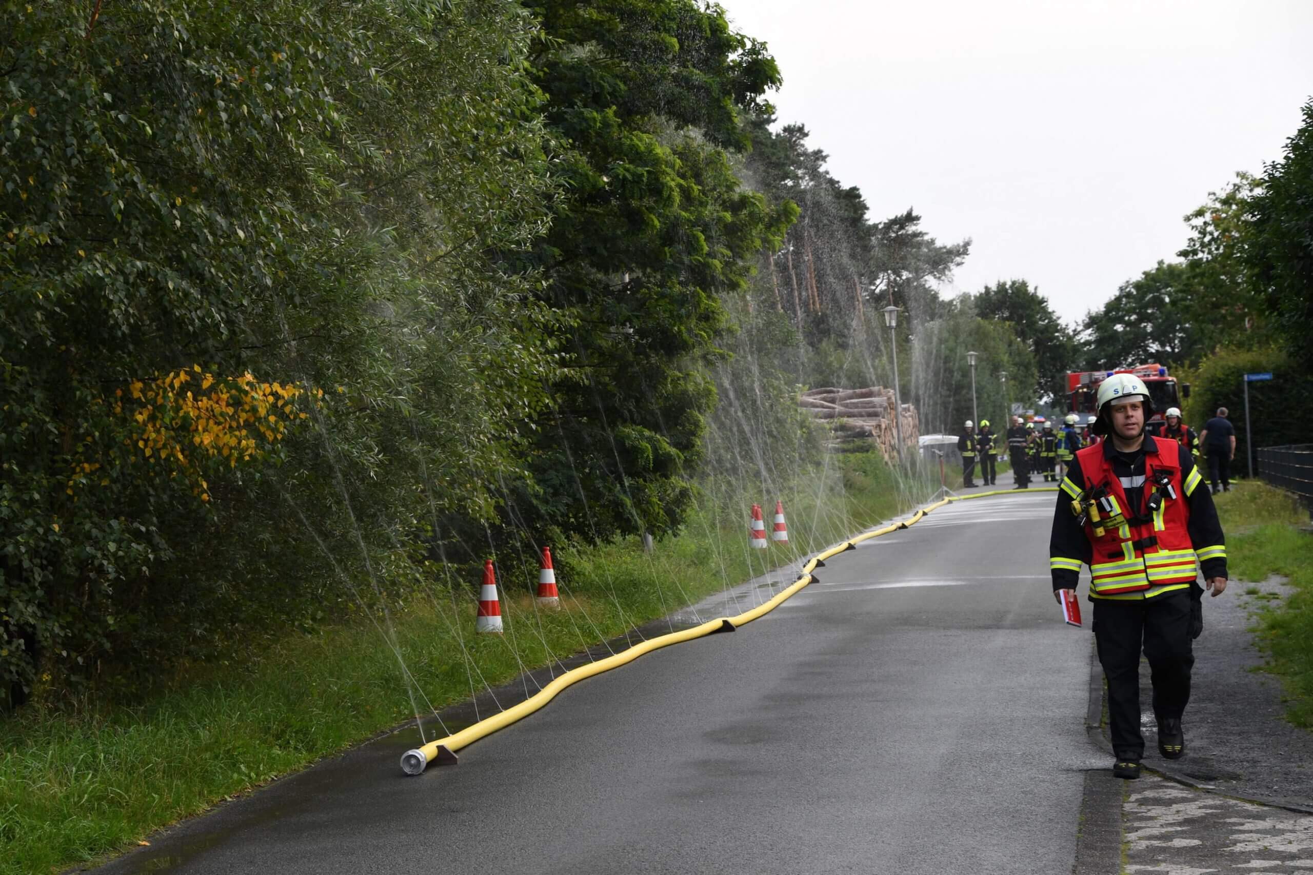 Das Übungsszenario sah Folgendes vor: In dem Nadelwald auf Verler Stadtgebiet, zwischen der Autobahn A2 und dem Waldweg in Gütersloh, ist es zu einem Waldbrand gekommen. Beim Eintreffen der ersten Einsatzkräfte hatte sich das Feuer bereits so rasch ausgebreitet, dass die Flammen nun auf eine Wohnsiedlung überzugreifen drohten. Der Schwierigkeitsgrad und die Belastung für die Einsatzkräfte steigerten sich stetig. In dem Test standen die Flammen so hoch und strahlten eine solche Hitze ab, dass auf dem Waldweg keins der 30 eingesetzten Fahrzeuge stehen konnte. Bedeutete: Wasserwerfer kamen zum Einsatz, die Wege für die Löschwasserversorgung wurden länger und zusätzlich mussten die Häuser der Siedlung gekühlt werden, um Schlimmeres zu verhindern.