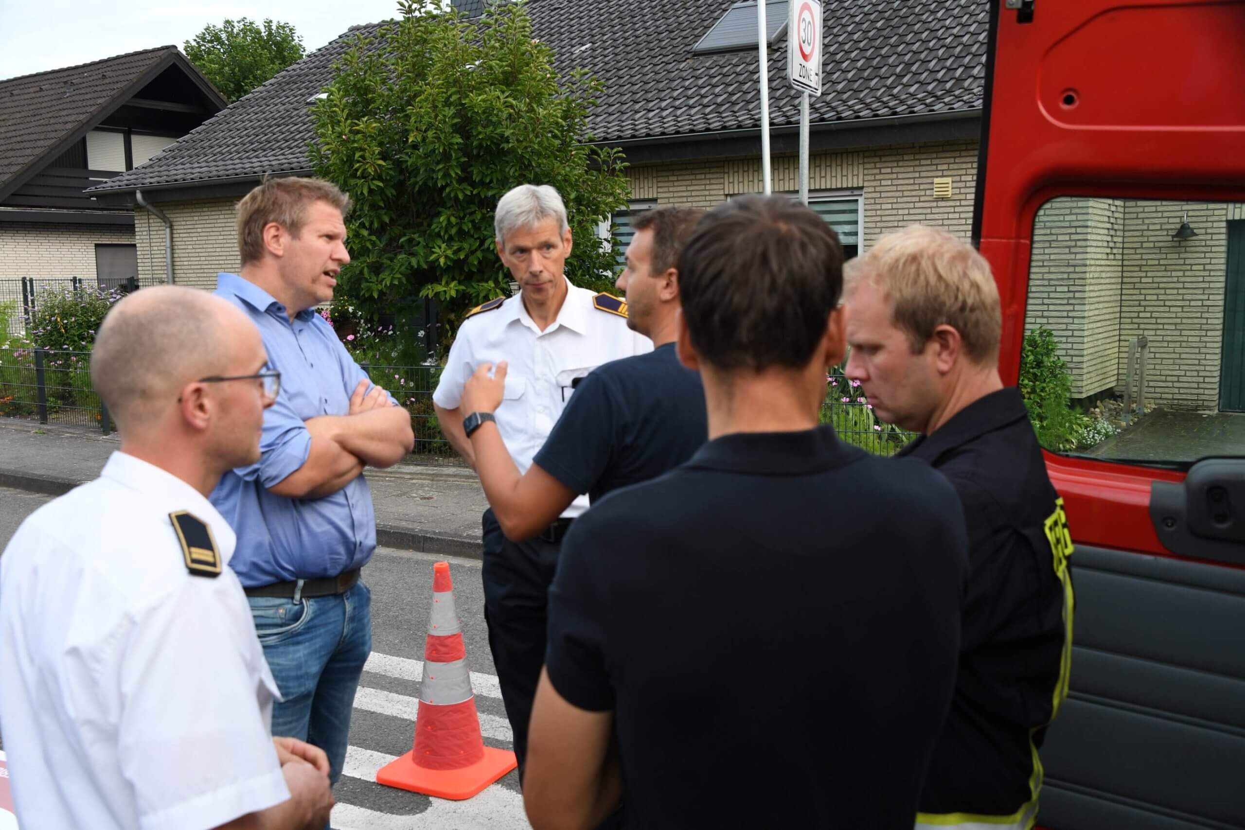 Bilder: (Fotos: Stadt Gütersloh) – Am Übungsort im Gespräch mit Einsatzkräften: der städtische Feuerwehrdezernent Carsten Schlepphorst und Feuerwehrchef Hans-Joachim Koch.