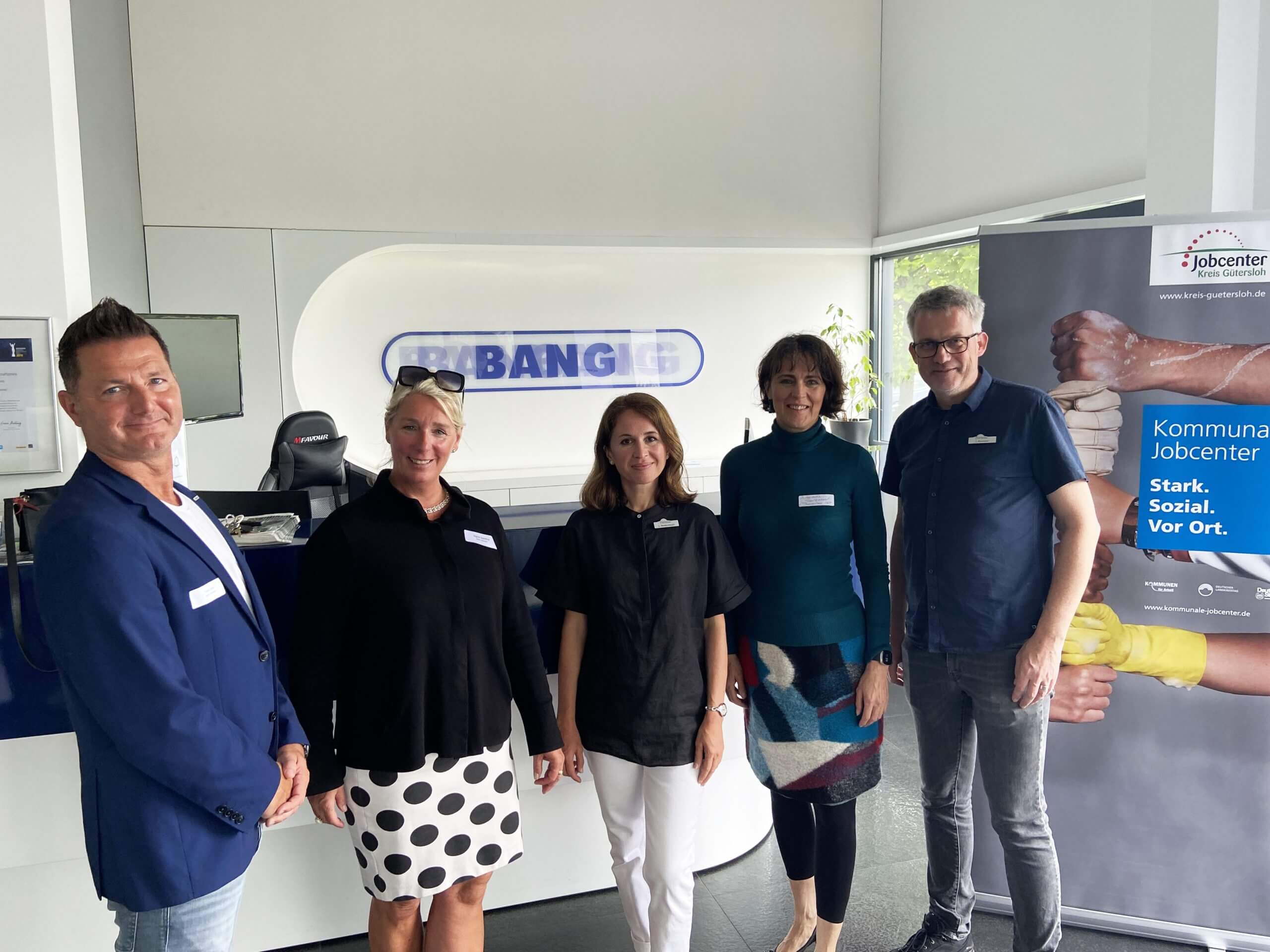 Die Mitarbeitenden des Jobcenters des Kreises Gütersloh und des BANG-Ausbildungsnetzwerks haben die Veranstaltung gemeinsam organisiert v.l.: Frank Icke, Ingvild Splietker (beide vom BANG-Ausbildungsnetzwerk), Liliya Niedermeyer, Anastasia Schürmann und Jürgen Blomeier (alle drei vom Jobcenter des Kreises Gütersloh). Foto: Kreis Gütersloh