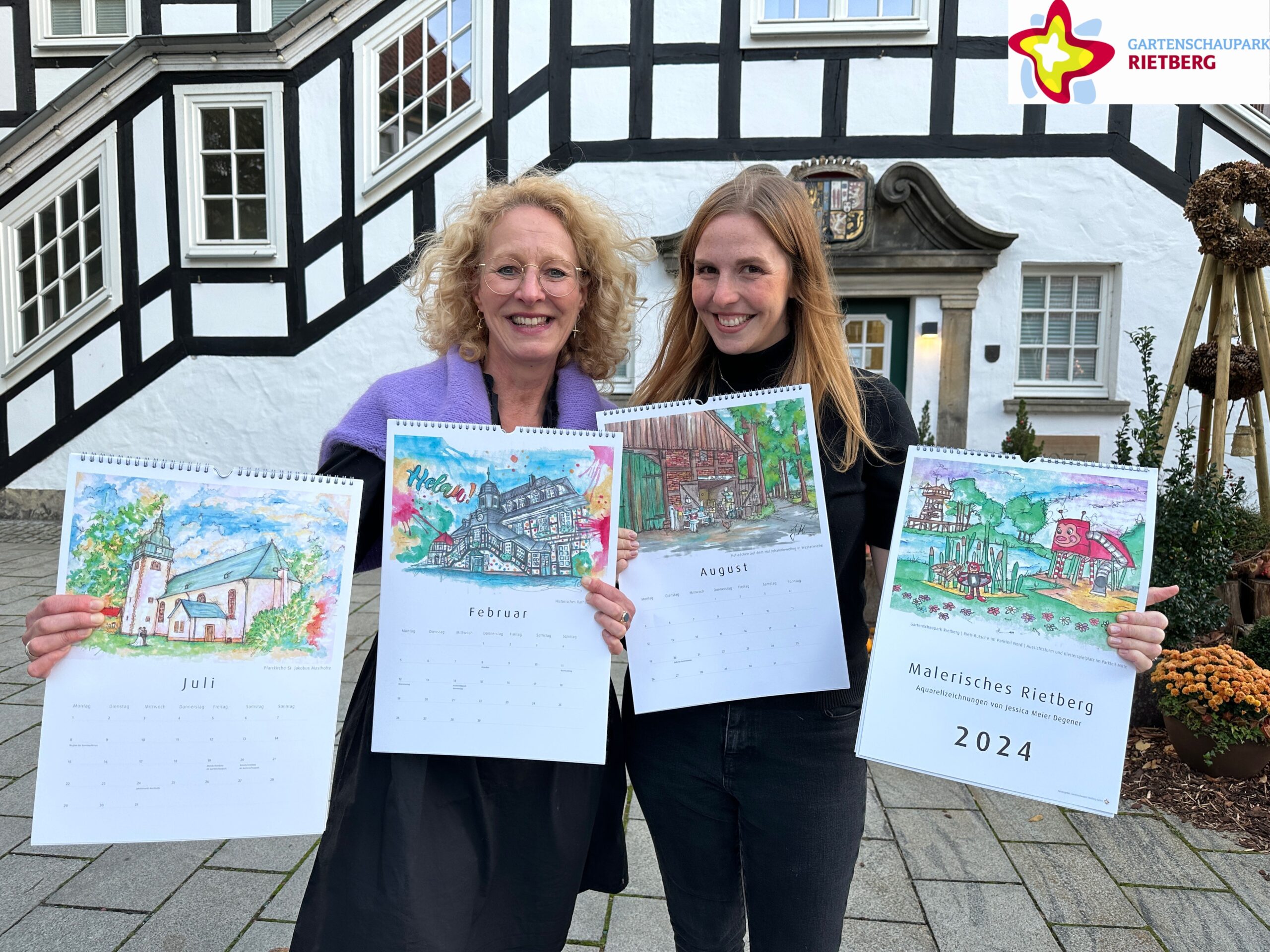 Foto: Touristik-Mitarbeiterin Elke Milsch (links) und Künstlerin Jessica Meier Degener mit dem neuen Kalender, der Rietberger Sehenswürdigkeiten aus künstlerischer Perspektive zeigt. Den Kalender gibt es für 12 Euro in der Touristikinformation. Foto: Stadt Rietberg.