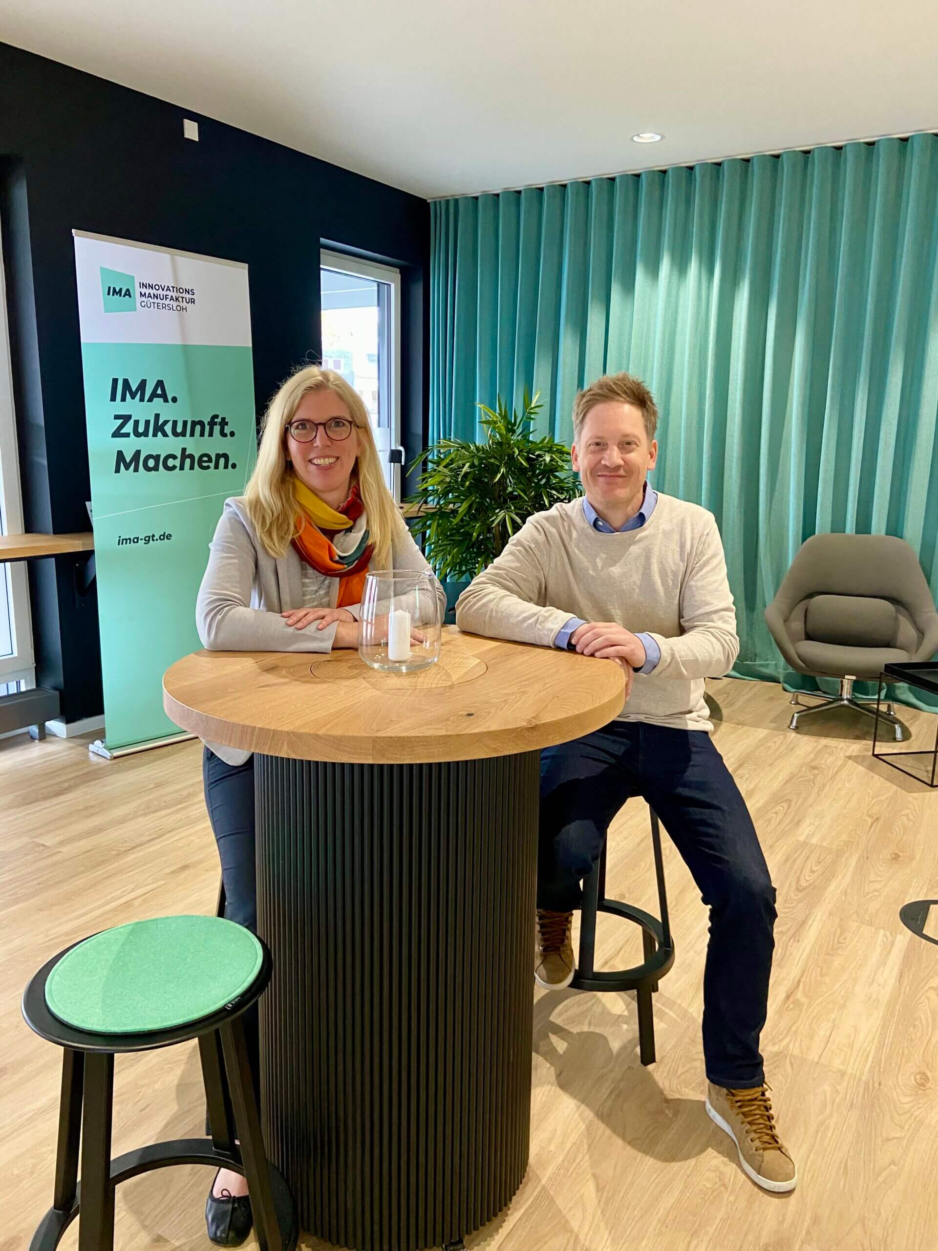Mirijam Handschack, Vorsitzende von gtogether – Unternehmen vor Ort e.V. und Jörg Rodehutskors, Geschäftsführer von IMA Innovationsmanufaktur Gütersloh GmbH laden zum KI Forum am 17. November 2023 ein.