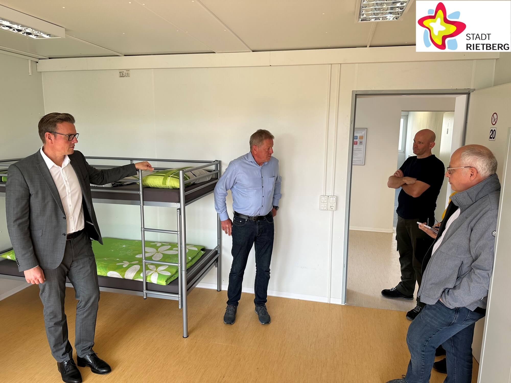 Mit Etagenbetten sind die einfach eingerichteten Räume im Container bestückt (hier im Obergeschoss). Bürgermeister Andreas Sunder, Wilfried Dörhoff (Leiter Abteilung Jugend, Soziales und Wohnen), Peter Kempkensteffen (Hausmeister-Team der Stadt Rietberg) und Matthias Setter (Fachbereichsleiter Bauen) sehen sich die Räume an (von links). Foto: Stadt Rietberg