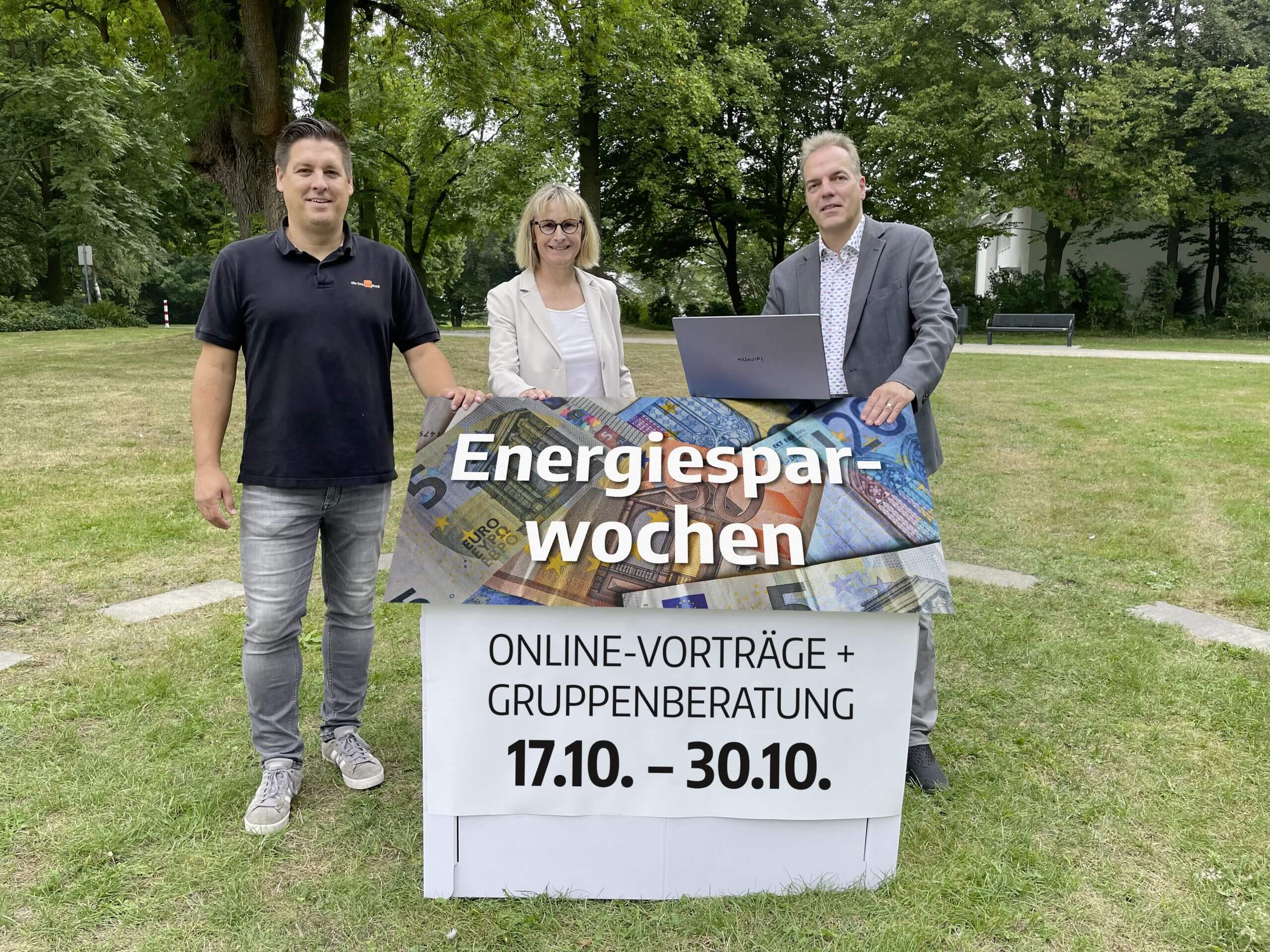 v. l. Energieberater und Referent Oliver Erdmann von der bauwerkstadt in Bielefeld, Projektleiterin Ulla Thering vom Kreis Gütersloh und Jörg Sutter, Photovoltaik-Experte und Referent der Verbraucherzentrale NRW in Düsseldorf, werben für den Besuch der digitalen Veranstaltungsreihe. Foto: Kreis Gütersloh