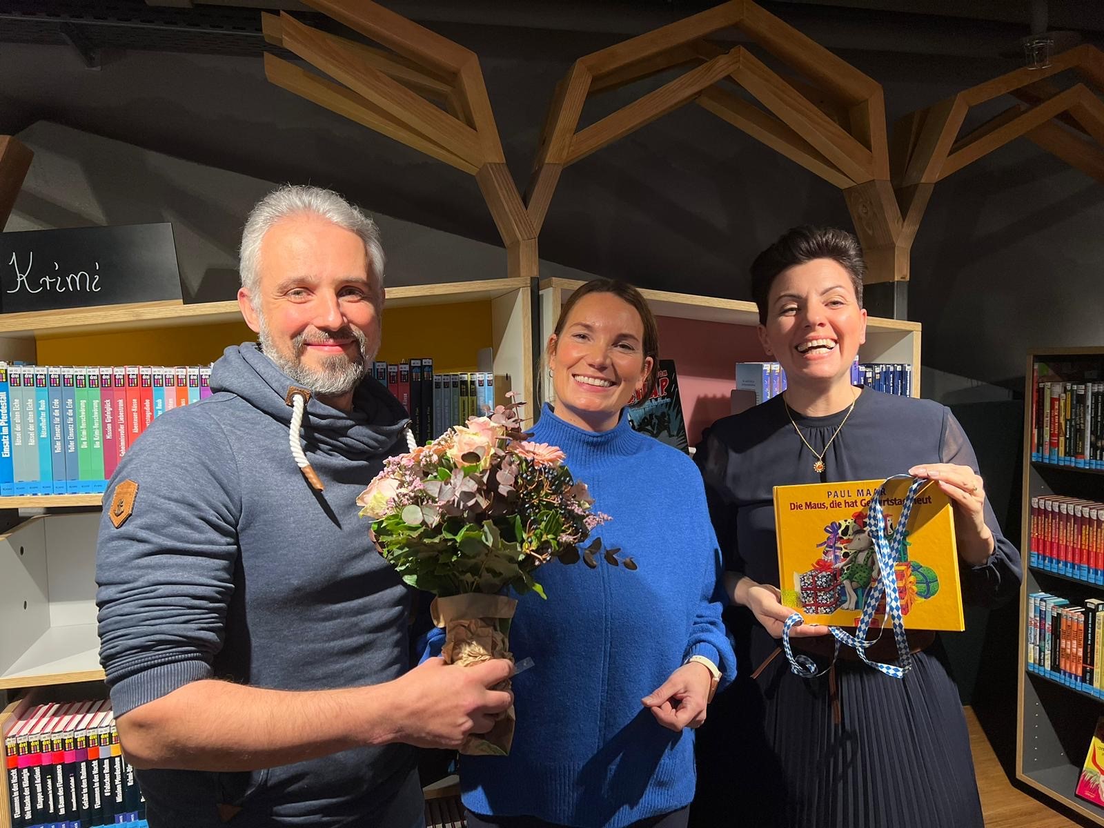 Michele Wegner, Leiter des Teams Programmarbeit/Veranstaltungen in der Stadtbibliothek Gütersloh, gratuliert Charlotte Kleßmann und Beatrix Wegmann zur Veranstaltungsreihe „Lesekrümel“, die sie seit über zehn Jahren erfolgreich ehrenamtlich planen und durchführen.