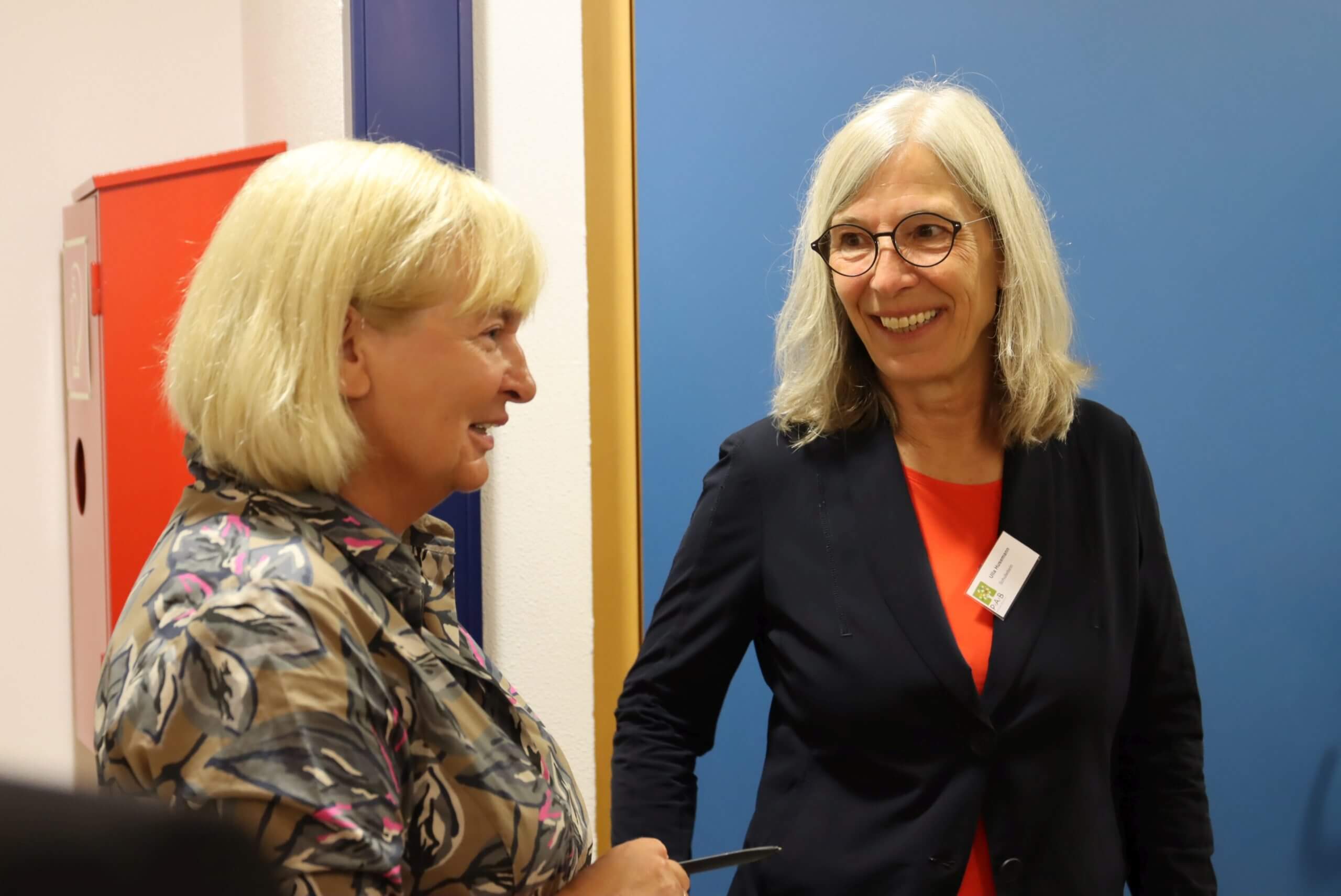 Schulleiterin Ulla Husemann (re.) führte in den Tag ein. „Schlechter Unterricht wird durch Digitalisierung nicht gut. Aber guter Unterricht wird besser.“ Links die Partnerschaftskoordinatorin und Übersetzerin, Rudite Markus.