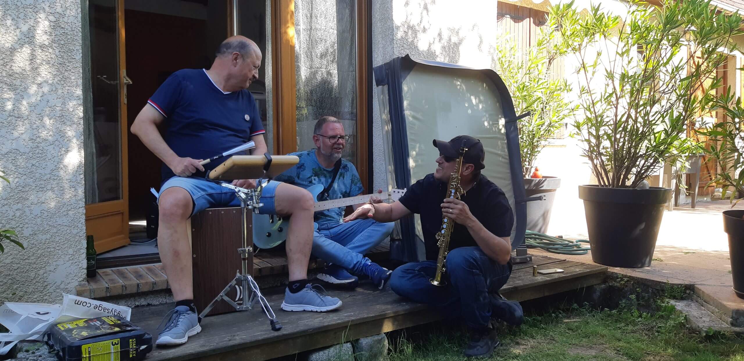 Die Band “Risome le Trio” aus Paris bereitet sich in gemütlicher Atmosphäre im Garten auf ihr Konzert vor