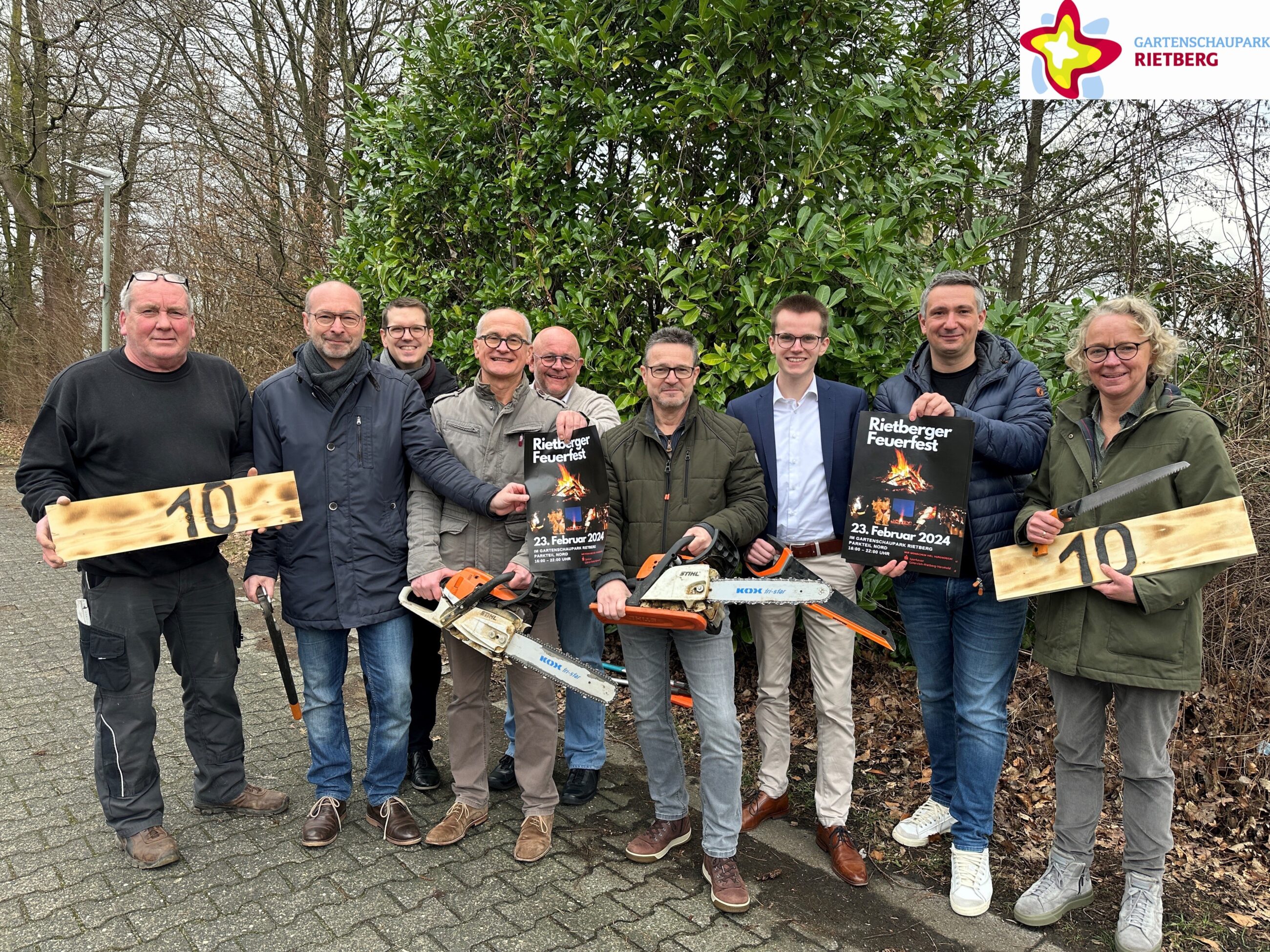 Foto: Sie freuen sich auf die erste große Veranstaltung im Jahr 2024 im Gartenschaupark, das Rietberger Feuerfest (von links): Parkmeister Helmut Kammermann, Fördervereins-Vorsitzender Frank Ehlebracht, Gartenschaupark-Geschäftsführer Johannes Wiethoff sowie vom Fördervereins-Vorstand Dr. Jacek Sakowski, Matthias Upmann, Uli Schönebeck, Marc Henrichs, Helge Pabst und Anja Rodenbeck. Foto: Stadt Rietberg