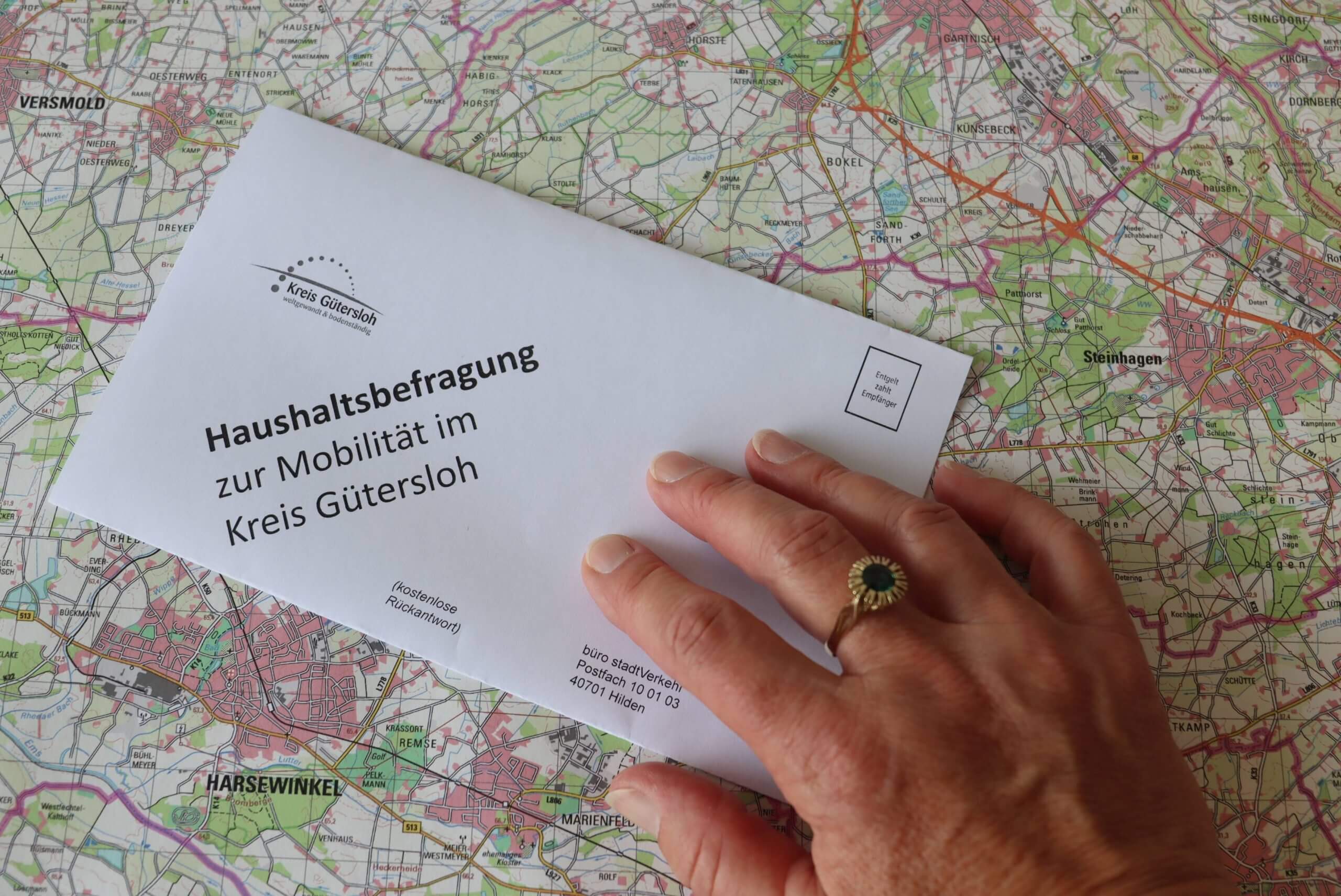 Bürgerbefragung zur Mobilität. 21.000 Haushalte bekommen in diesen Tagen diesen Brief in den Postkasten. Die Umfrage ist anonym. Das Rückporto übernimmt der Kreis. Man kann auch online antworten. Foto: Kreis Gütersloh