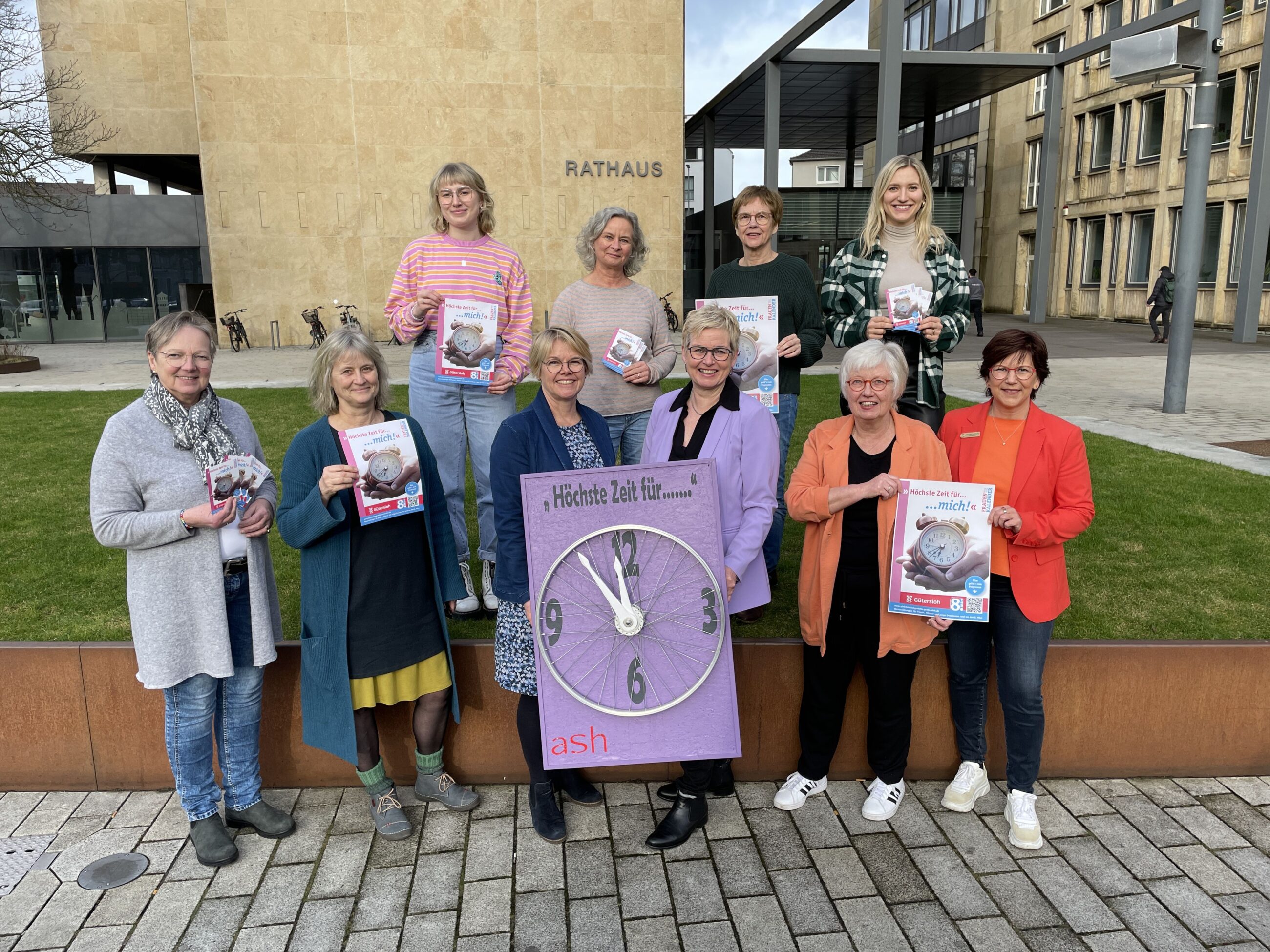 Vertreterinnen der Vorbereitungsgruppe halten das Werkstück in Händen, das Beschäftigte der ash zum Motto für den Frauenkalender zum internationalen Frauentag erstellt haben und laden zu den vielfältigen Veranstaltungen ein: (v.l.) Ulla Lory (Maria 2.0), Anne Haverland (SPD-Frauen Gütersloh/ Arbeitsgemeinschaft Sozialdemokratischer Frauen (ASF)), Lisa Marie Becker (Jusos), Simone Hanneforth (Grünes Frauenforum, Bündnis 90/DIE GRÜNEN), Angela Droste (LWL – Klinikum Gütersloh, Referat für Chancengleichheit), Inge Trame (Gleichstellungsbeauftrage der Stadt Gütersloh), Ingrid Kersting, (Sozialdienst Katholischer Frauen), Roswitha Horstmann (Soroptimist International Club), Alina Skobowsky-Natwan (Frauenberatungsstelle Gütersloh / Fachstelle gegen sexualisierte Gewalt), Claudia Holtkamp (Soroptimist International Club). Foto: Stadt Gütersloh