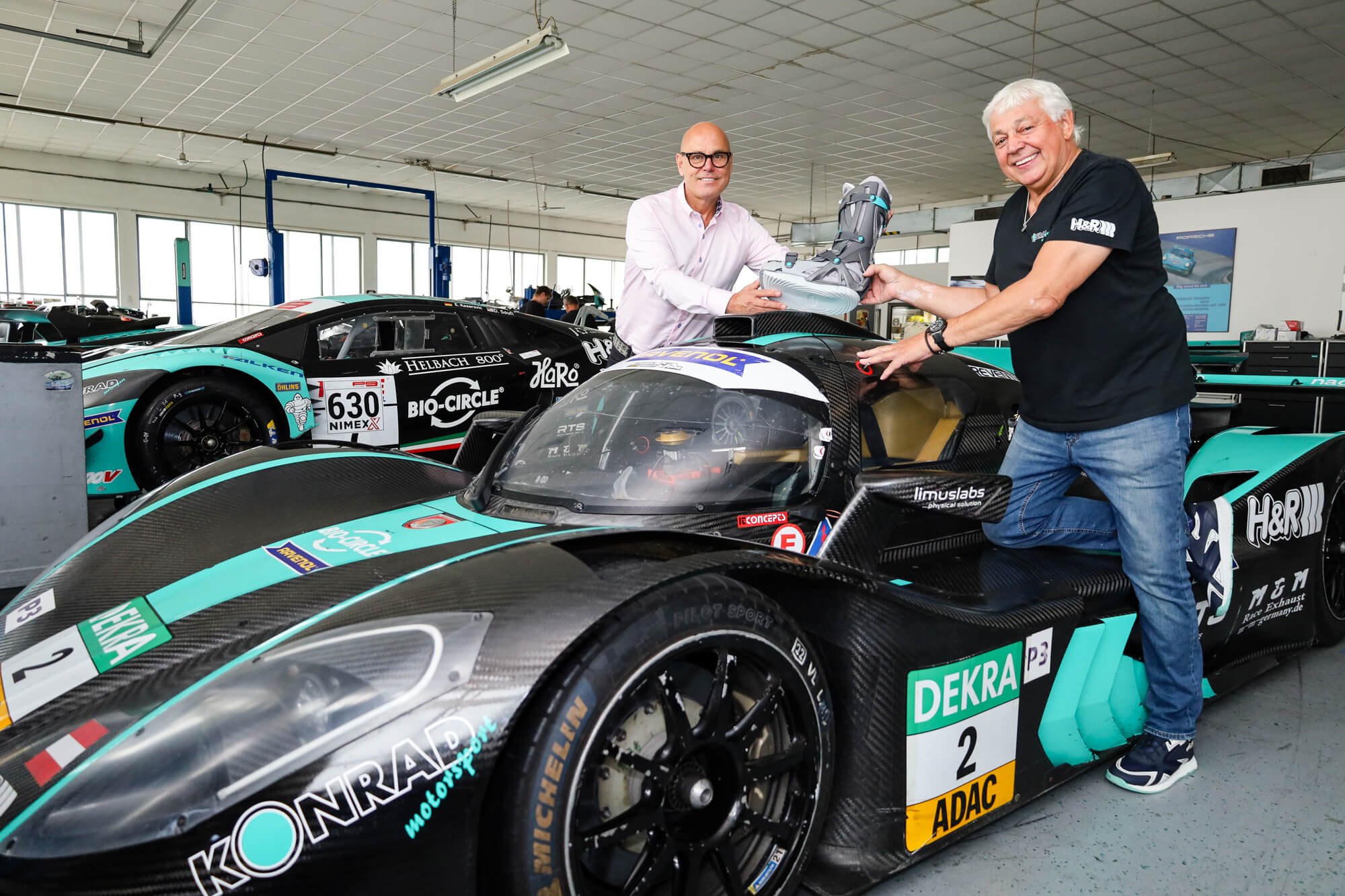 Zurück auf der Rennstrecke: Franz Konrad (rechts) gibt den Spezialschuh zurück an Dr. Dieter Mann. Am kommenden Wochenende sitzt er wieder am Steuer des Lamborghini beim Rennen in Italien.
