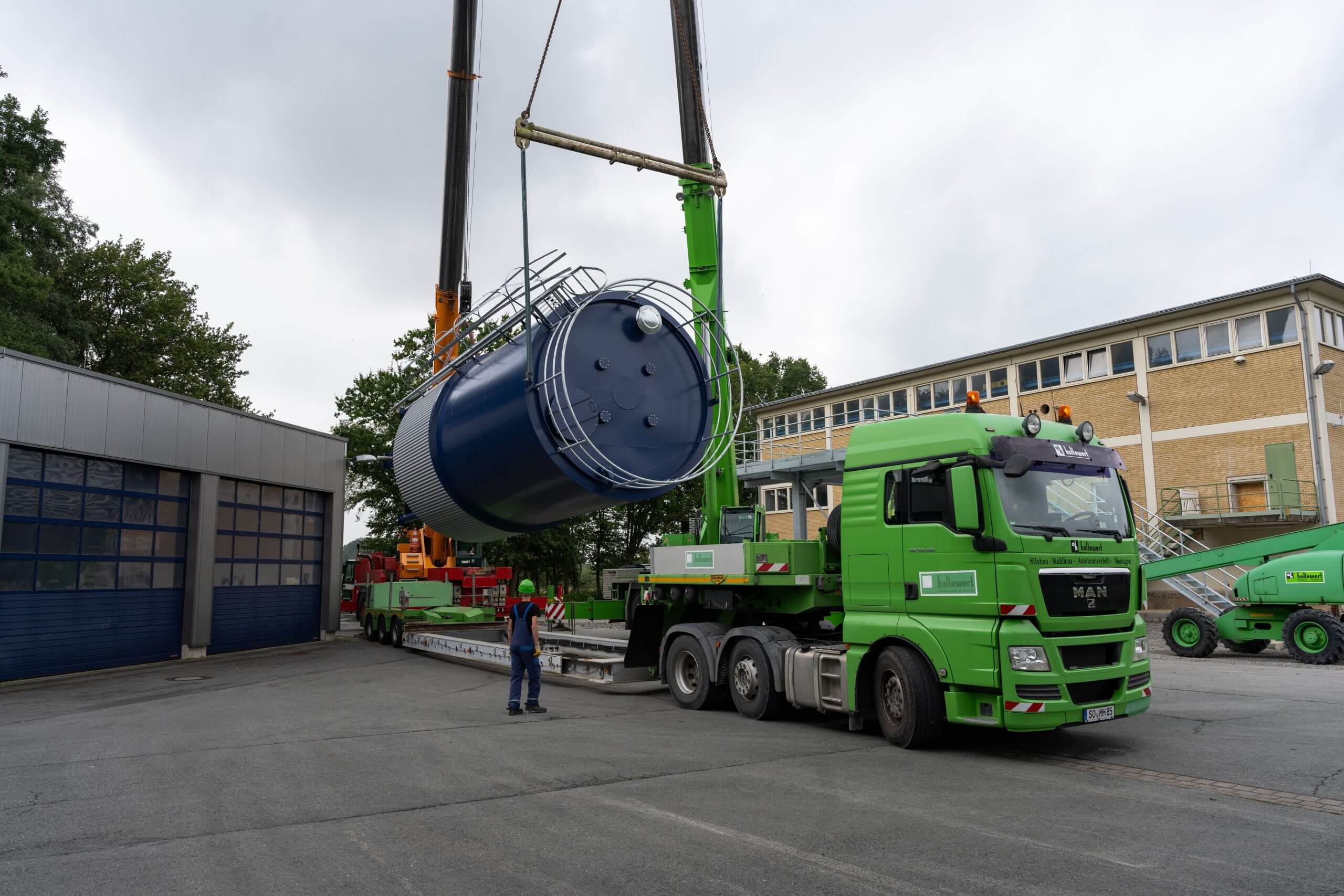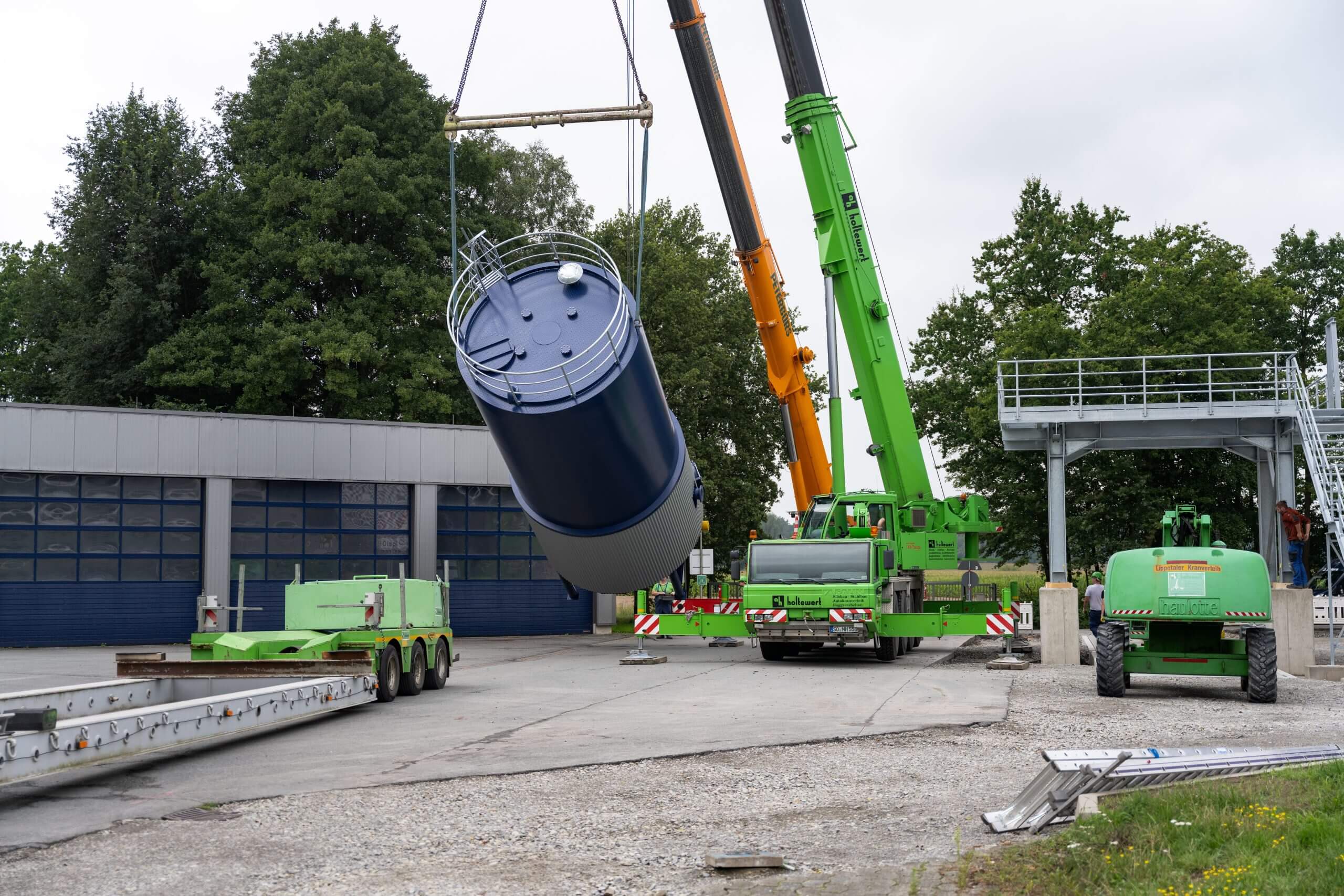 BU: Ein spezieller LKW hat das acht Meter hohe Silo am Klärwerk Putzhagen angeliefert. Foto: Bockermann Fritze IngenieurConsult