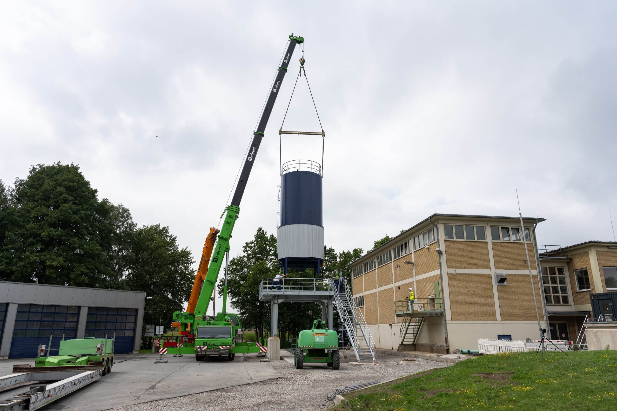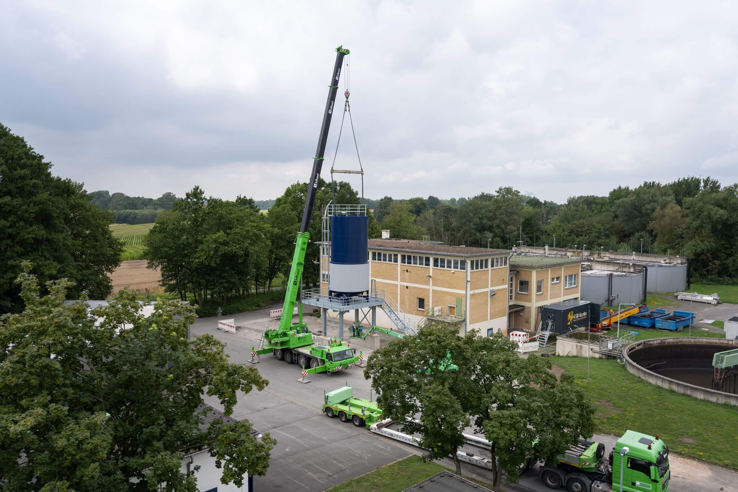 BU: Das neue Silo ragt inklusives des Untergestellt nun 15, 8 Meter über das Gelände der Kläranlage am Putzhagen. Foto: Bockermann Fritze IngenieurConsult