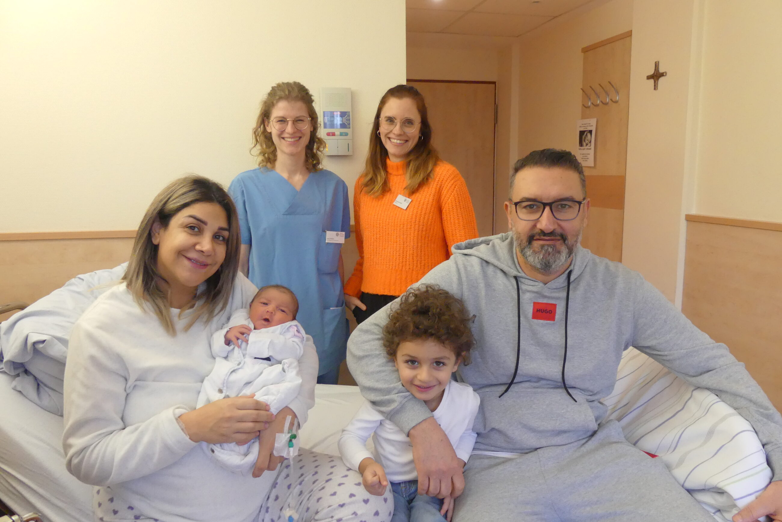 Foto: Neujahrsbaby: Die kleine Aylen erblickte am Montagmorgen im Gütersloher Sankt Elisabeth Hospital das Licht der Welt. Gemeinsam mit den Eltern Silvana (37) und Mohamad Manana (44) sowie mit dem Bruder Kazem freuen sich Ärztin Anne Möller (hinten links) und Hebamme Vivien Kornfeld (hinten rechts).