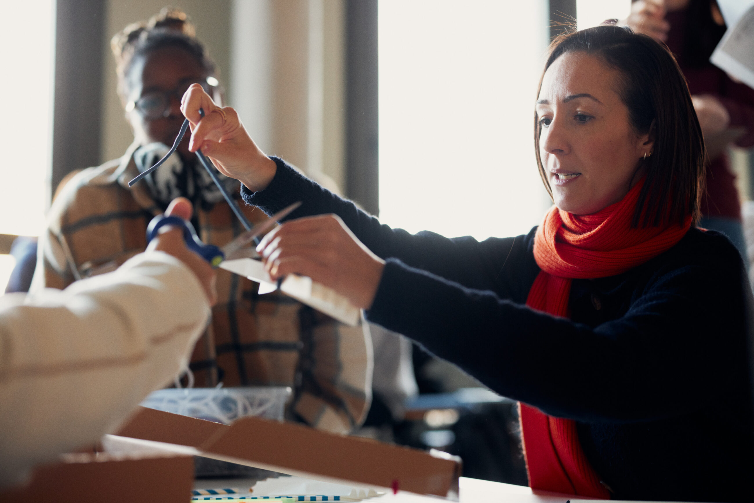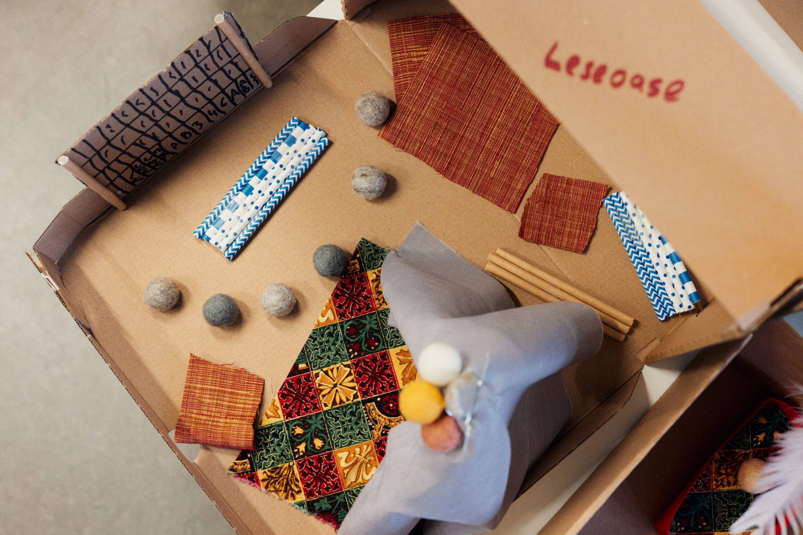 Ibrahim setzt direkt die Schere an und schneidet fast den ganzen Boden aus dem Schuhkarton heraus. „Das ist ein großes Fenster. Kinder brauchen Tageslicht“, sagt sein Gruppenmitglied Hassana. Es entsteht eine Lese-Oase. Im Zentrum steht ein – im Verhältnis zum eher kleinen Schuhkarton – ein übergroßes Tipi zum Verweilen. Darunter liegt ein Teppich aus Stoffresten, der durch seine Farben ein wenig an Weihnachten erinnert und zum Herumlümmeln einlädt. Die imaginären Miniaturkinder finden im Raum von Hassanas Gruppe noch weitere Sitz- und Entspannungsmöglichkeiten.