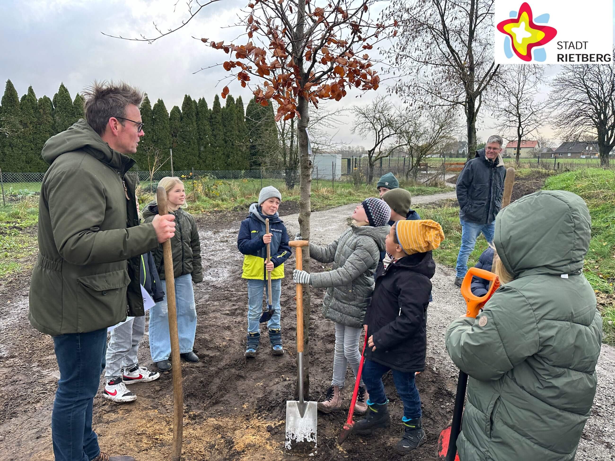 Foto: Unter anderem die Kommunionkinder 2023 haben einen eigenen Baum gespendet. Hilfe beim Einpflanzen gab es von Bürgermeister Andreas Sunder. Foto: Stadt Rietberg