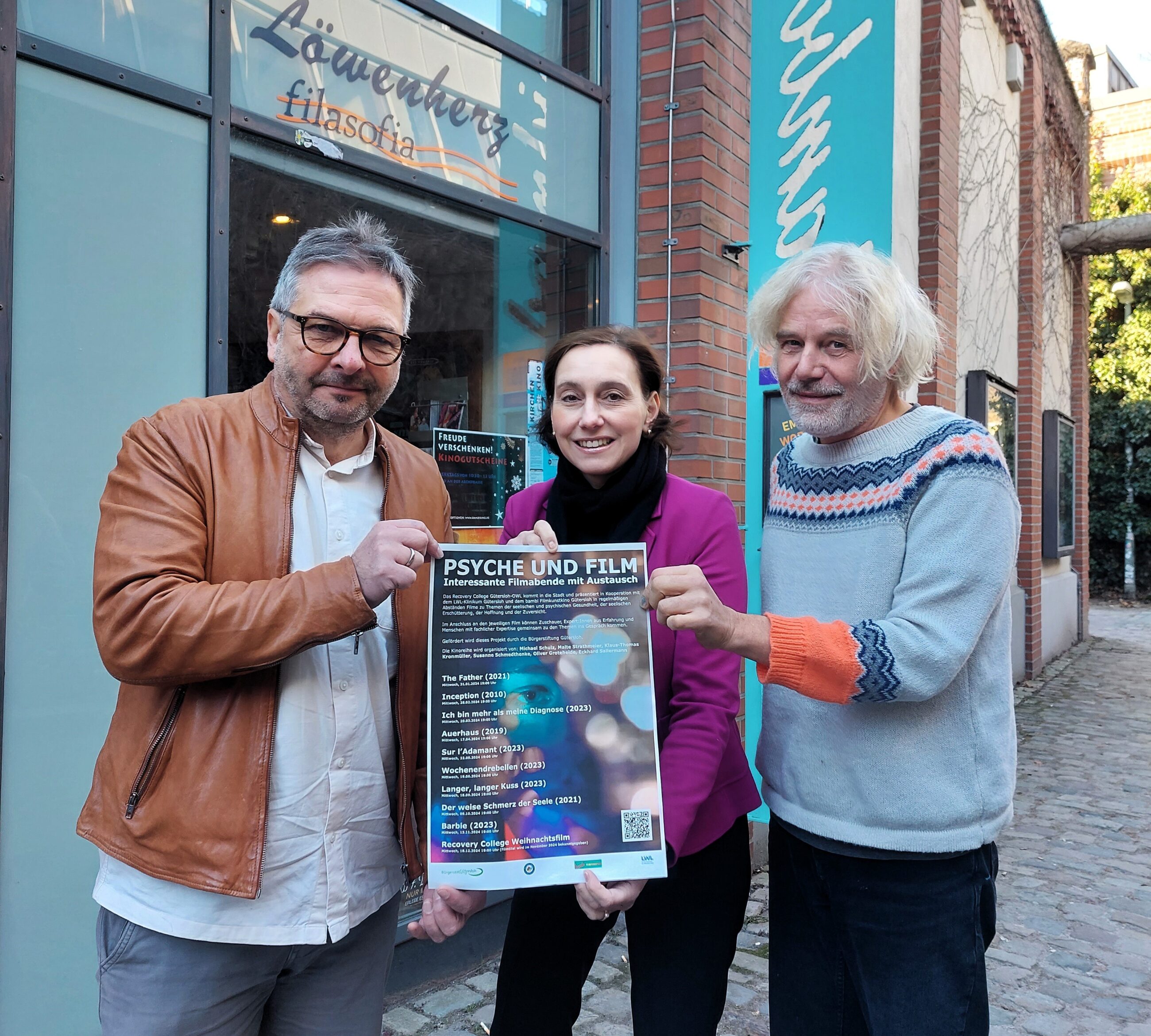 Psyche und Film: Zur neuen Filmreihe des Recovery College Gütersloh-OWL im Bambi-Kino laden (v. l.) Prof. Dr. Michael Schulz vom LWL-Klinikum, Katrin Meyer, Vorstandsvorsitzende der Bürgerstiftung, und Bambi-Betreiber Oliver Groteheide ein.