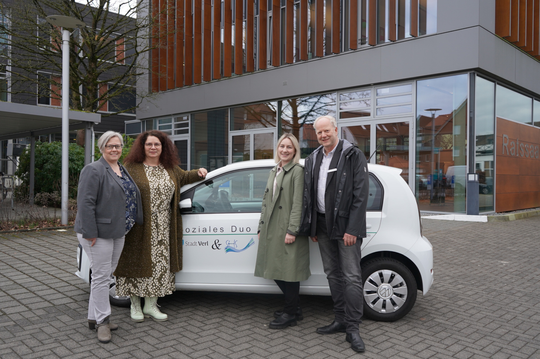 Sind gespannt auf die weiteren Erfahrungen mit dem Modellprojekt „Soziales Duo“: (v. l.) Katrin Vilmar (Beigeordnete der Stadt Verl), Christiane Vornholt (Leiterin des Fachbereichs Soziales der Stadt Schloß Holte-Stukenbrock), Janine Weiß und Olaf Junker (Beigeordneter der Stadt Schloß Holte-Stukenbrock).