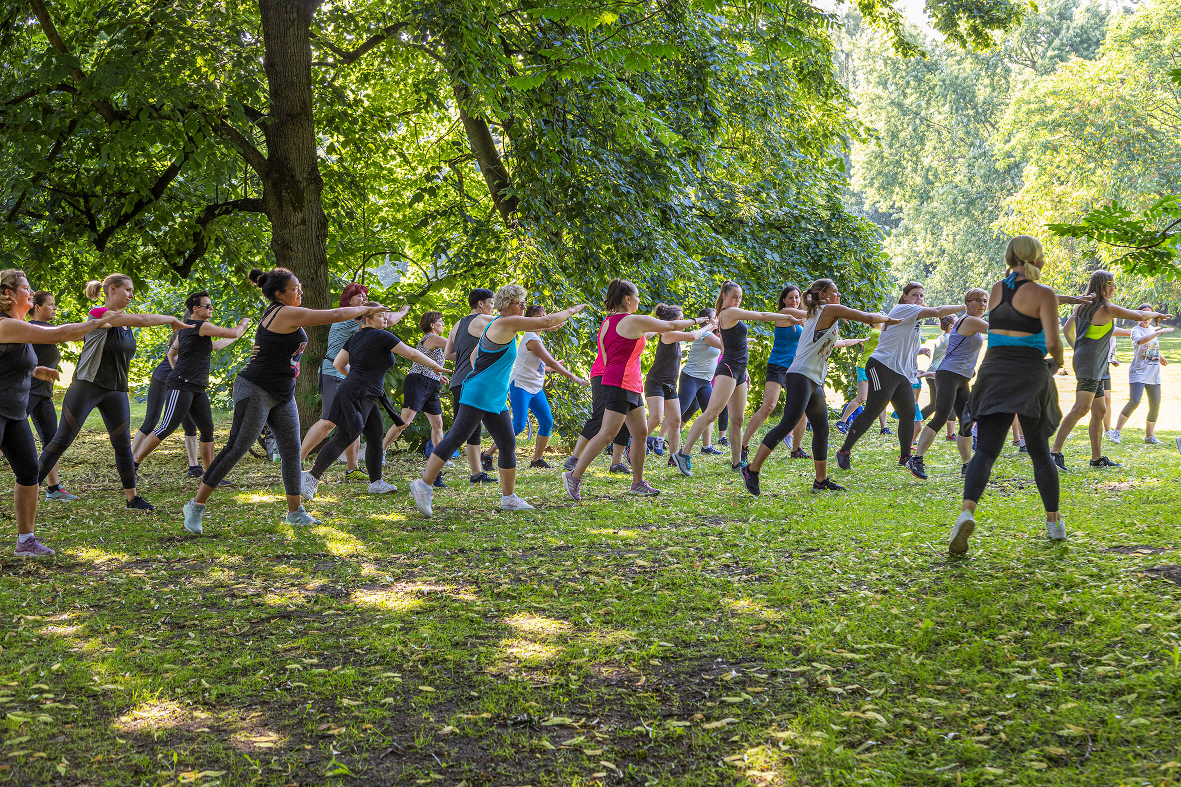 BU Zumba: Die großen Bäume im Stadtpark spenden Schatten, damit es nicht zu heiß wird beim Zumba. Foto: Maximilian Gaisendrees