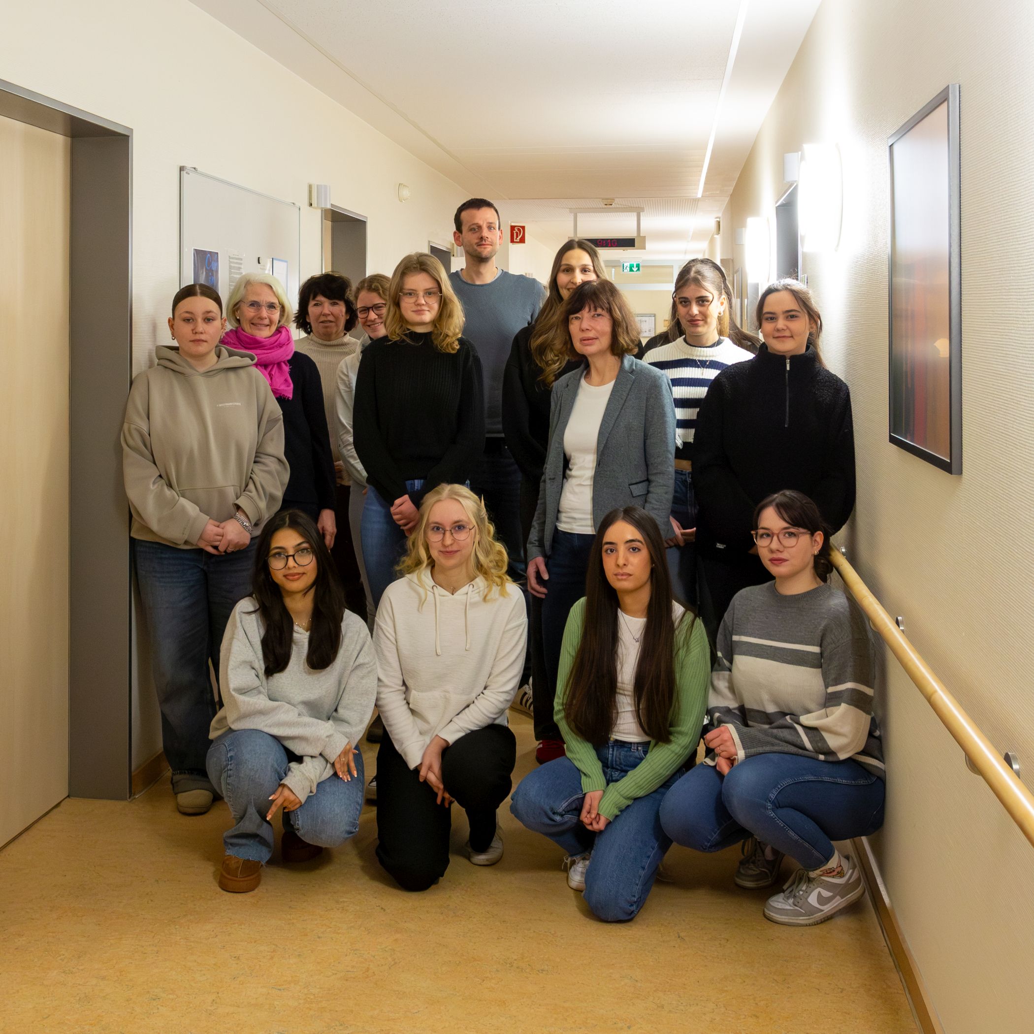 Gruppenfoto mit Lehrkräften und Vertreter:innen des LWL-Klinikums Gütersloh beim viertägigen Besuch des Pädagogik-Leistungskurses der Anne-Frank-Schule im Klinikum an der Buxelstraße.