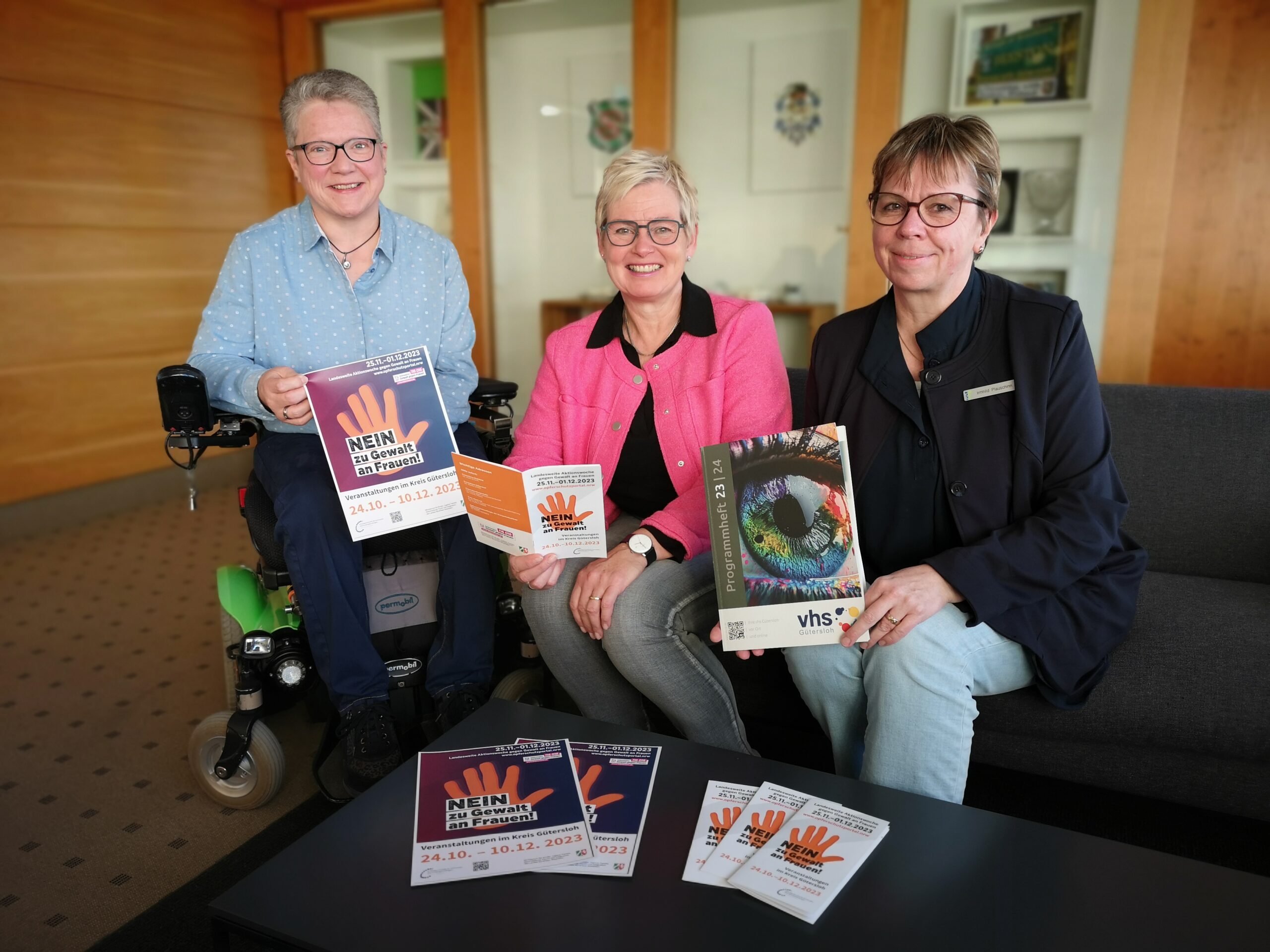 BU: (v.l.) Annette Runte (Vorsitzende des Behindertenbeirates der Stadt Gütersloh), Inge Trame (Gleichstellungsbeauftragte der Stadt Gütersloh) und Irmhild Plauschinn (Pädagogische Leiterin der VHS Gütersloh) laden zum digitalen WenDO-Kurs am 2. und 3. Dezember ein. Das Besondere: Durch das Online-Format können auch Frauen mit familiären oder pflegerischen Verpflichtungen oder mit körperlichen Einschränkungen teilnehmen.