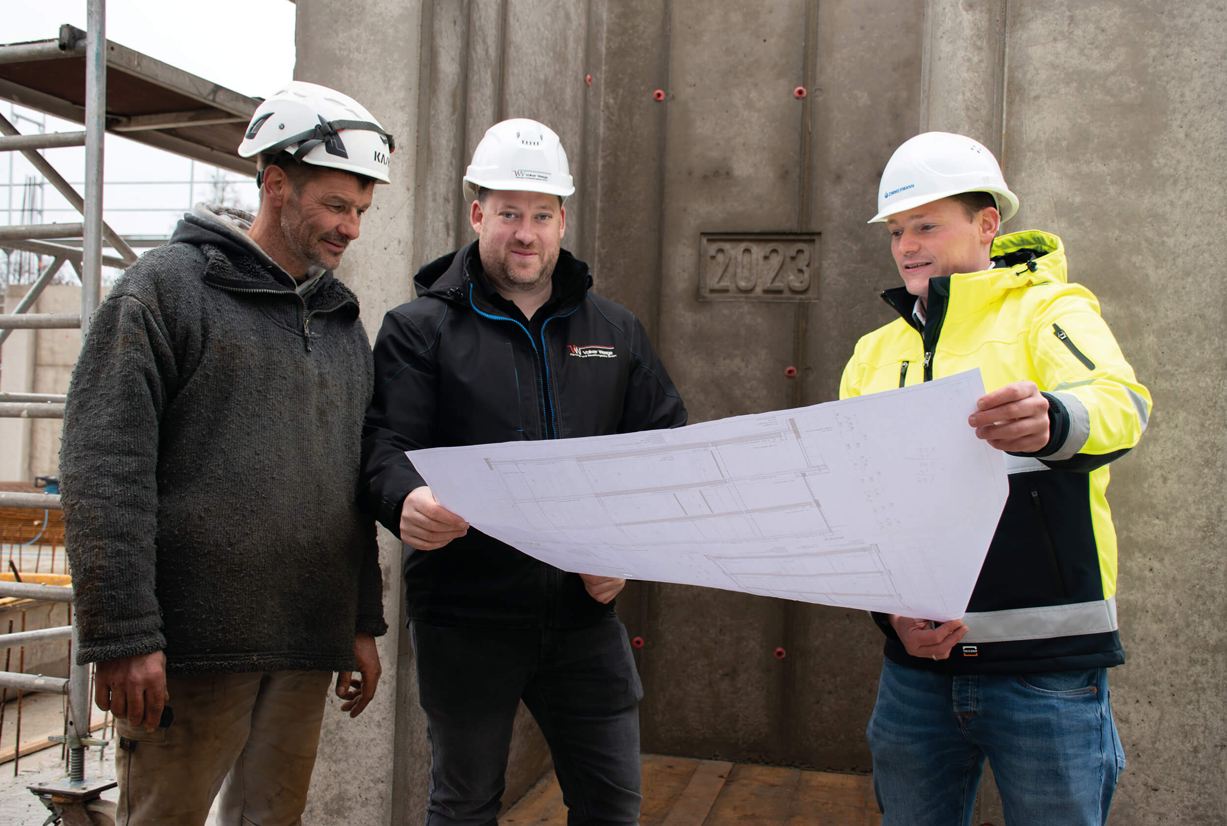 Das Jahr des Baubeginns „2023“ ist im Fahrstuhlschacht verewigt: Polier Dieter Bökamp, Oberbauleiter Martin Strobender und Zimmermann-Geschäftsführer David Zimmermann (v. l.) haben heute das Neubauprojekt an der Gottlieb-Daimler-Straße vorgestellt.