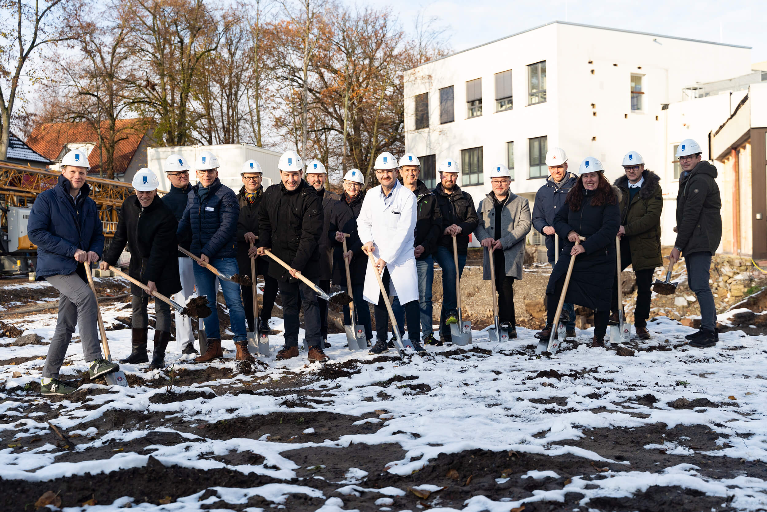 Bildunterschrift: Los geht es mit dem OP-Neubau: Vertreterinnen und Vertreter des Klinikums, der Stadt und der beteiligten Unternehmen beim symbolischen Spatenstich auf dem Baufeld an der Virchowstraße.
