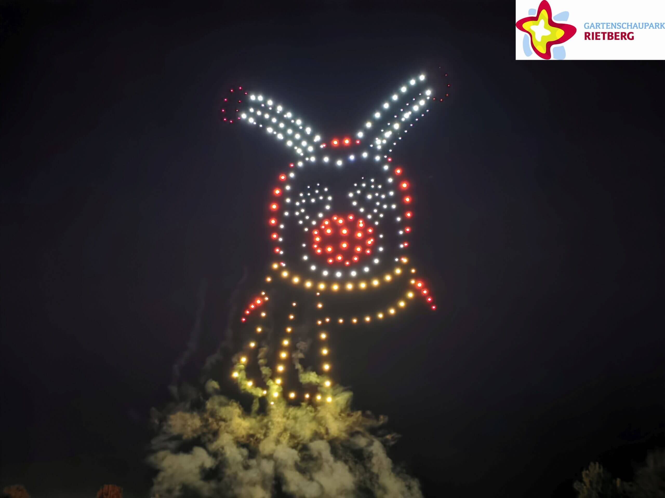 Maskottchen Rieti durfte natürlich fehlen, als 300 beleuchtete Drohnen beim ersten „Rietberger Himmelsleuchten“ zum 15-jährigen Parkbestehen bunte Bilder in den Abendhimmel malten. 5000 Besucher verfolgten das Spektakel.