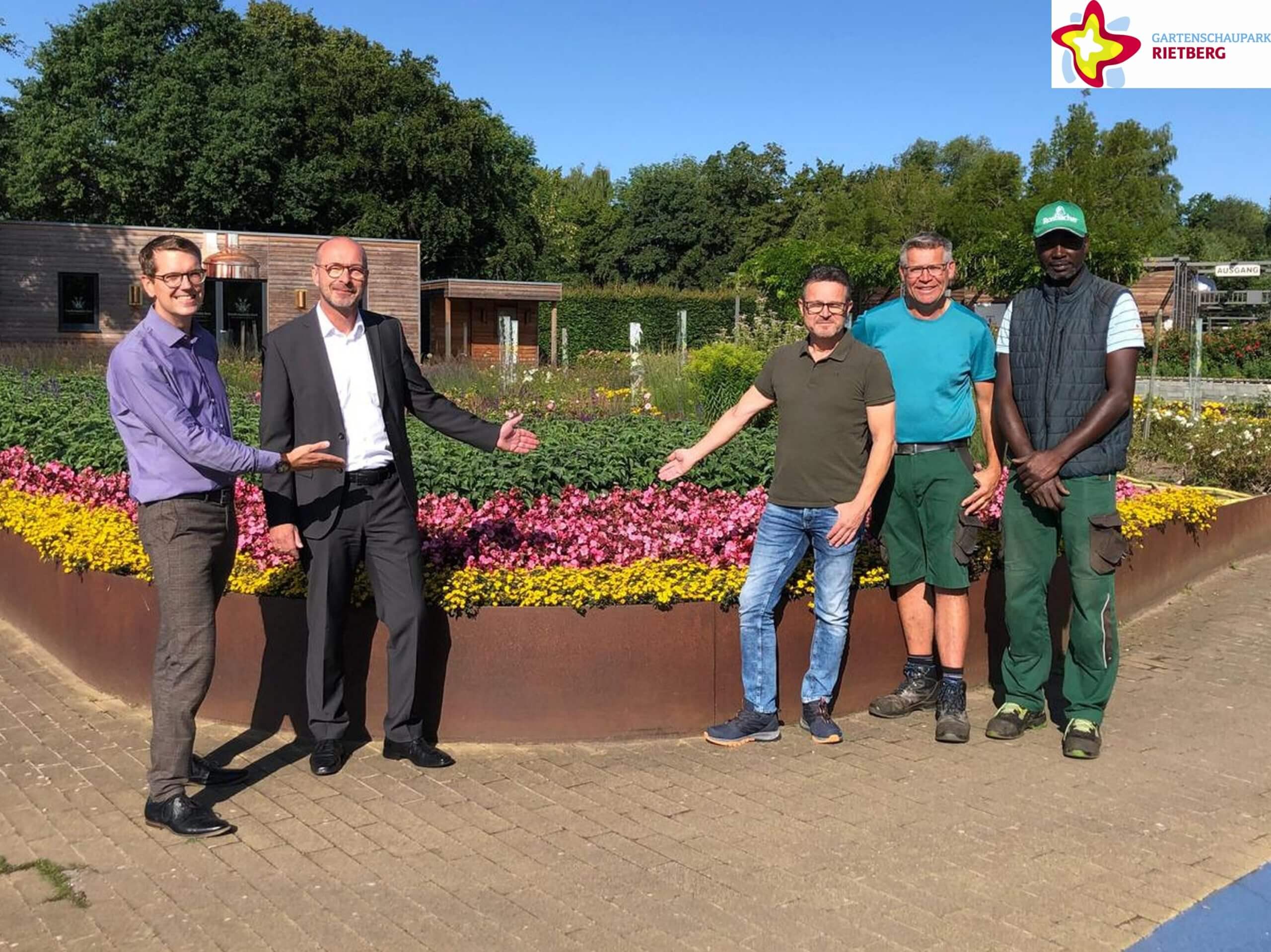 Foto: Nicht nur die Besucher erfreuen sich an den toll blühenden Blumen im Gartenschaupark, sondern auch (von links) Geschäftsführer Johannes Wiethoff, Frank Ehlebracht (Vorstandsmitglied der Sparkasse Gütersloh-Rietberg-Versmold), Ulrich Schönebeck (Förderverein Gartenschaupark), Chefgärtner Marco Rüschkamp und sein Kollege Abdoulheiyou Boubakar. Foto: Gartenschaupark Rietberg.