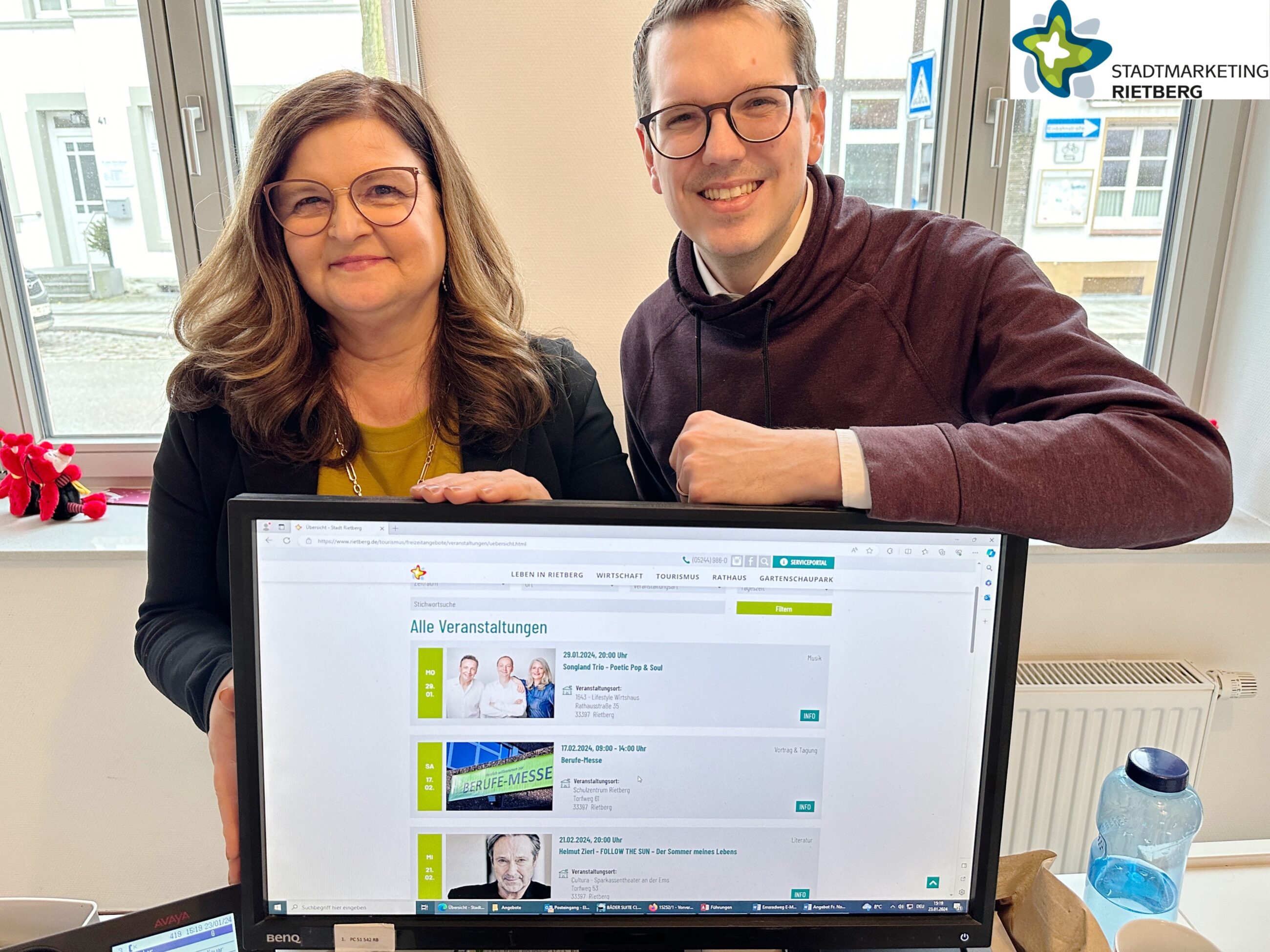 Stadtmarketing-Mitarbeiterin Sabine Kovar und Geschäftsführer Johannes Wiethoff zeigen den Terminkalender auf www.rietberg.de, in den ab sofort auch Gruppen, Vereine und andere Veranstalter ihre Events einpflegen können. Foto: Stadt Rietberg