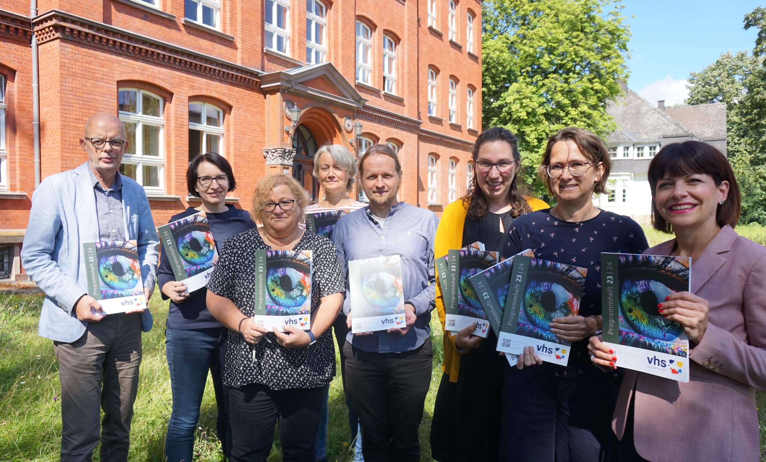 BU: Präsentieren das neue abwechslungsreiche Jahresprogramm der VHS Gütersloh: Dr. Elmar Schnücker (Leiter VHS), Tina Orzel (Verwaltungsmitarbeiterin), Claudia Heitvogt (Verwaltungsmitarbeiterin), Doris Wittenbrink (Verwaltungsmitarbeiterin), Dr. Dennis Köthemann (pädagogischer Leiter VHS), Dr. Mariella Gronenthal (Stellv. Leiterin VHS), Martina Gochermann (Verwaltungsleiterin), Andjelka Krstić (pädagogische Assistentin)