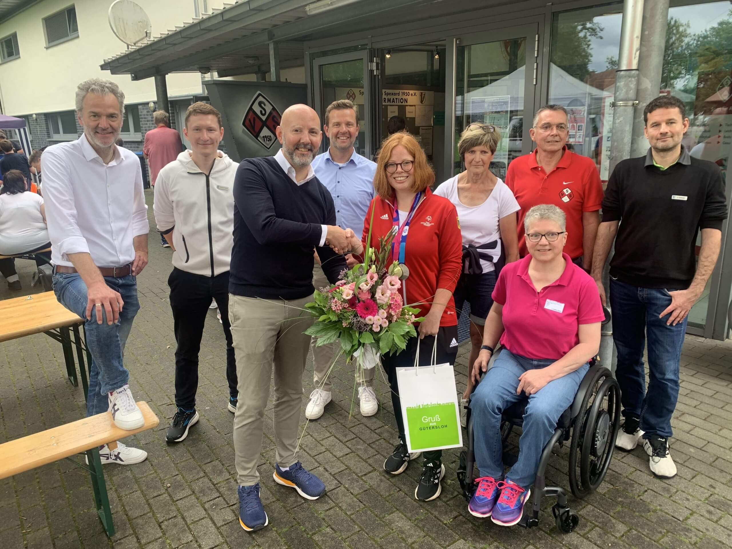 Ein Highlight war sicher auch der Besuch der Gütersloherin Sophia Schmidt, die in diesem Jahr bei den Special Olympics World Games in Berlin gleich mehrere Medaillen gewonnen hat. Im Tennis errang sie im Doppel eine Goldmedaille und eine Silbermedaille im Einzel. Der Beigeordnete für den Bereich Sport, Henning Matthes, beglückwünschte die 24-Jährige herzlich zu diesem großartigen Erfolg und überreichte ihr einen großen Blumenstrauß sowie kleine Aufmerksamkeiten: „Du kannst sehr stolz auf Deine Leistung sein“, so Matthes. „Und die Stadt Gütersloh ist es auch.“ Danach nahm Matthes die mitgebrachten Medaillen selbst einmal in die Hand. „Schließlich hat man nicht alle Tage die Möglichkeit, Gold- und Silbermedaillen so nahe zu kommen“, kommentierte Matthes. „Die Medaillen kriegen einen Ehrenplatz in einer Vitrine“, kündigte Sophia Schmidt an. „Noch hängen sie zuhause an einem selbstgestalteten Ast.“ Darüber hinaus berichtete sie, dass es bereits ihre zweiten World Games waren. Schon 2011 war sie mit 12 Jahren, als jüngste deutsche Teilnehmerin, in Athen dabei. Über die Mamre-Patmos Förderschule in Bethel ist sie zum Sport gekommen und hat seitdem bereits reichlich Erfahrung in Wettbewerben gesammelt. Sie nahm unter anderem in Bremen, München, Düsseldorf, Hannover und Berlin an nationalen Spielen teil und auch die nächsten Turniere stehen schon im Kalender. Bei dem inklusiven Sporttag in Spexard stand sie allen Interessierten nun Rede und Antwort und sah sich auch selbst um.