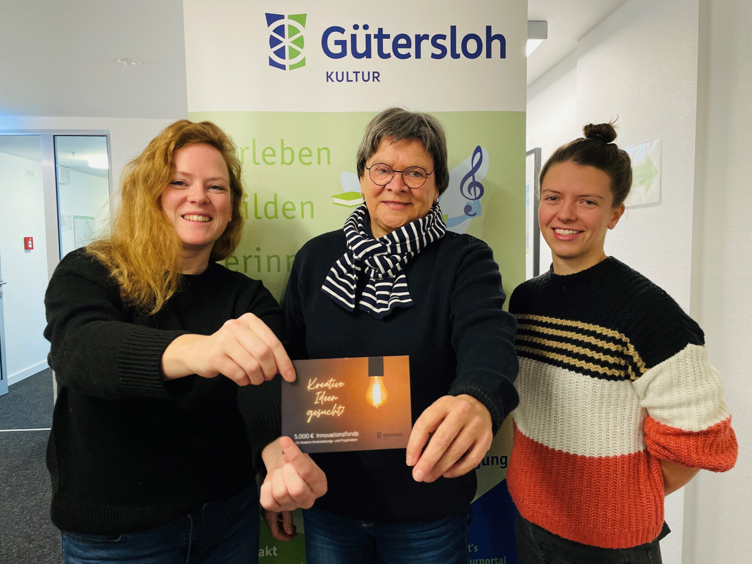 (v.l.) Die Leiterin des Fachbereichs Kultur Lena Jeckel beglückwünscht die Gewinnerin des Innovationspreises 2023 Gertraud Theermann ebenso wie die städtische Kulturstreetworkerin Kira Schäfer. Foto: Stadt Gütersloh.