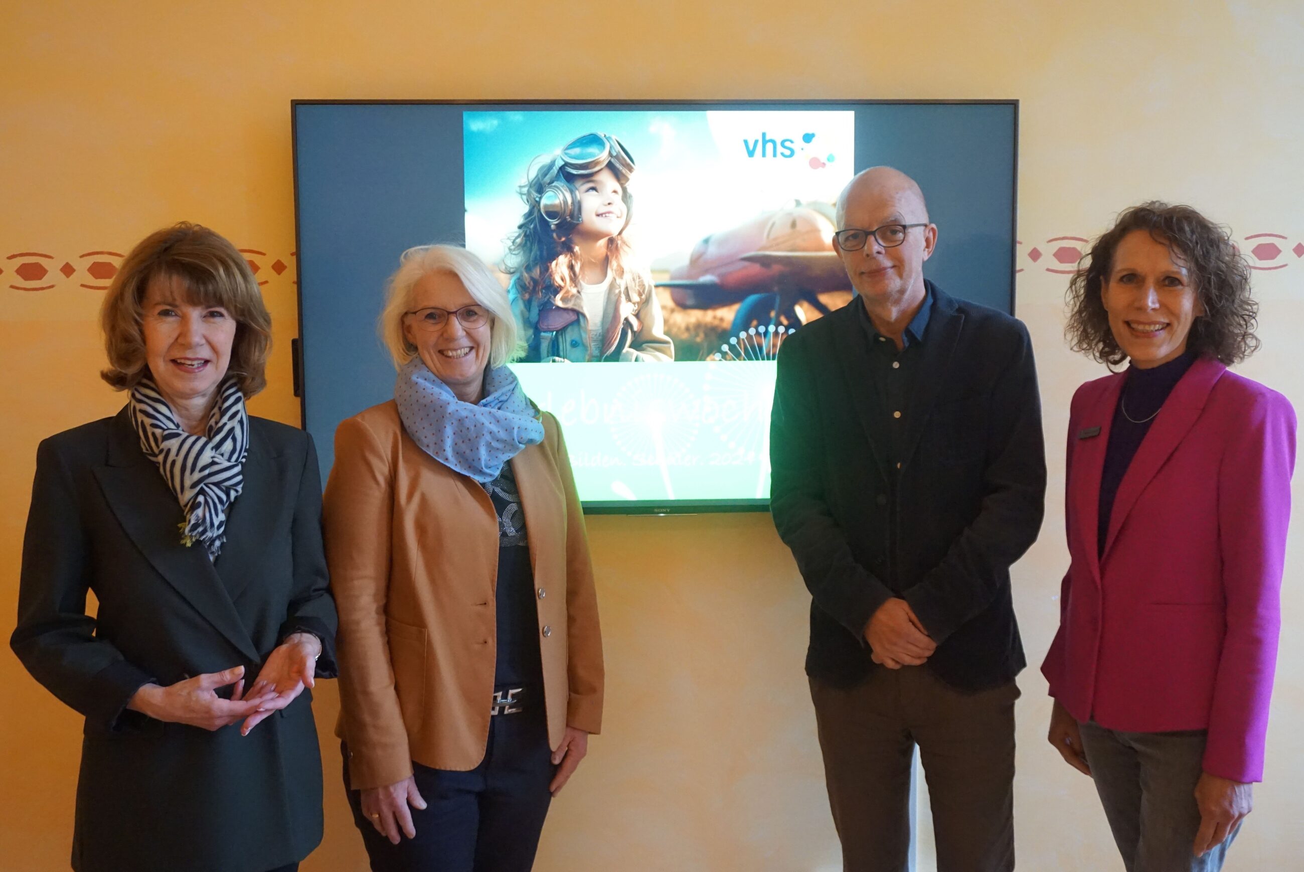 Dr. Martina Schwartz-Gehring (Stellv. Vorstandsvorsitzende der Osthushenrich-Stiftung), Claudia Holle (Geschäftsführerin der Osthushenrich-Stiftung), Dr. Elmar Schnücker (VHS-Leitung) und Henrike Dulisch (Pädagogische Leiterin der VHS) haben das neue Programm der „Erlebniswochen Ferien.Bilden.Schüler“ vorgestellt. Foto: Stadt Gütersloh