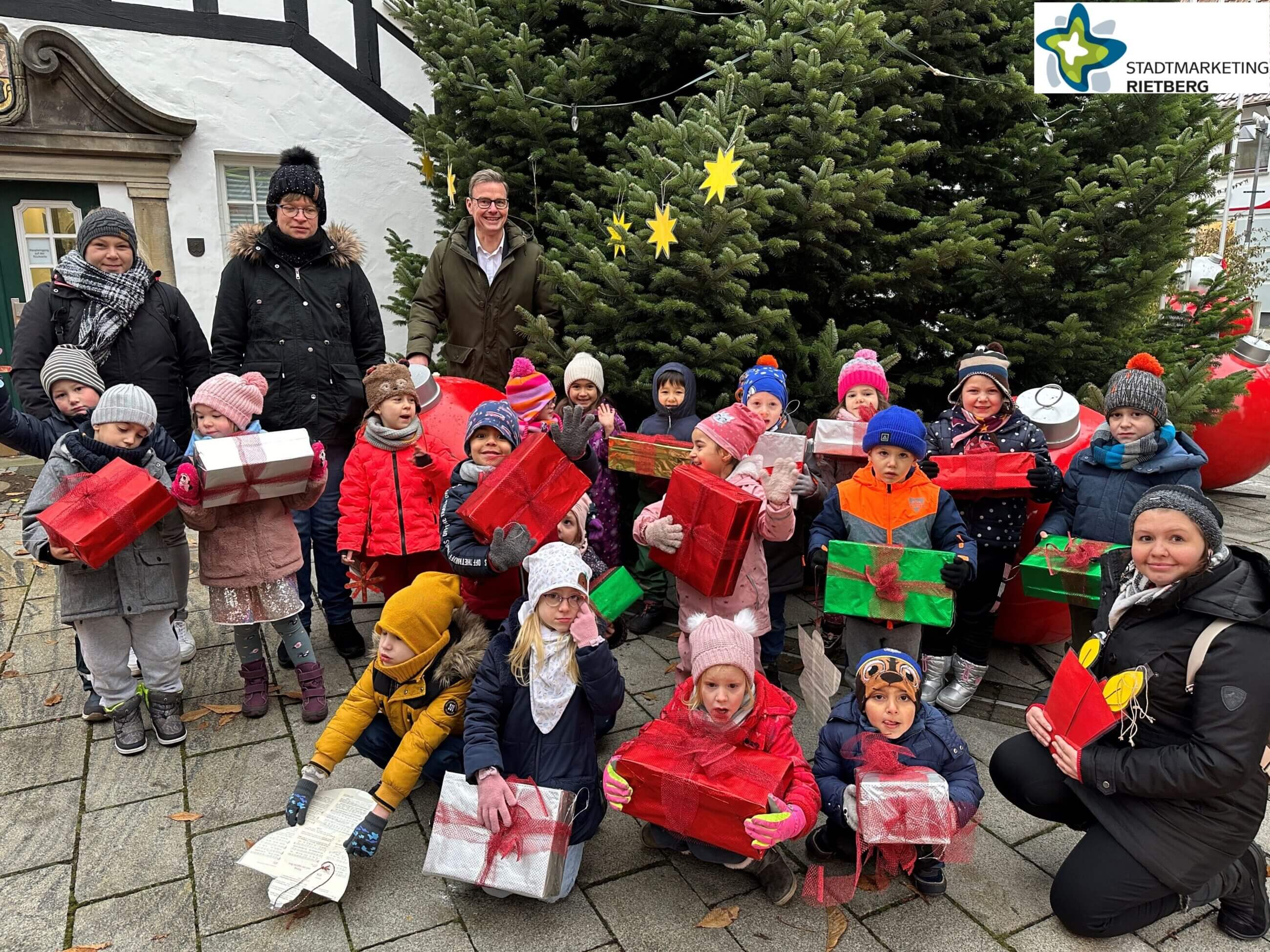 Rietberg. In Rietbergs „guter Stube“ wird es weihnachtlich. 20 Vorschulkinder aus der evangelischen Kita „Die Arche“ haben am Freitag den großen Weihnachtsbaum vor dem Rathaus mit unzähligen Geschenken, Sternen und anderen Deko-Elementen verziert.
