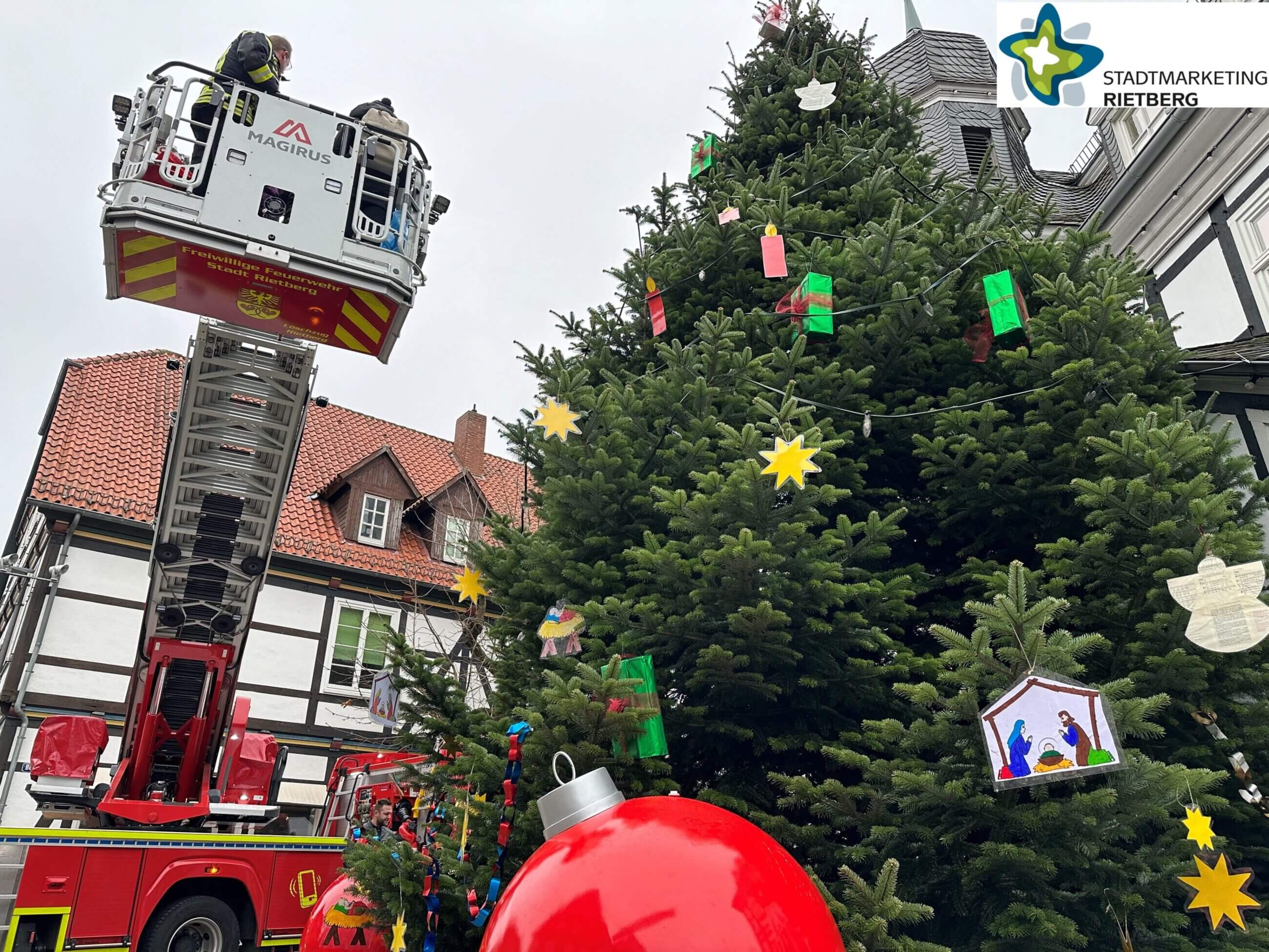 Stadtmarketing_Baumschmücken3: Ein besonders schöner, großer Baum hat dieses Jahr zur Weihnachtszeit seinen Platz vor dem Rathaus gefunden. Am Freitag haben 20 Vorschulkinder den Baum mit Unterstützung von Stefan Hainke vom Löschzug Rietberg weihnachtlich geschmückt. Fotos: Stadt Rietberg