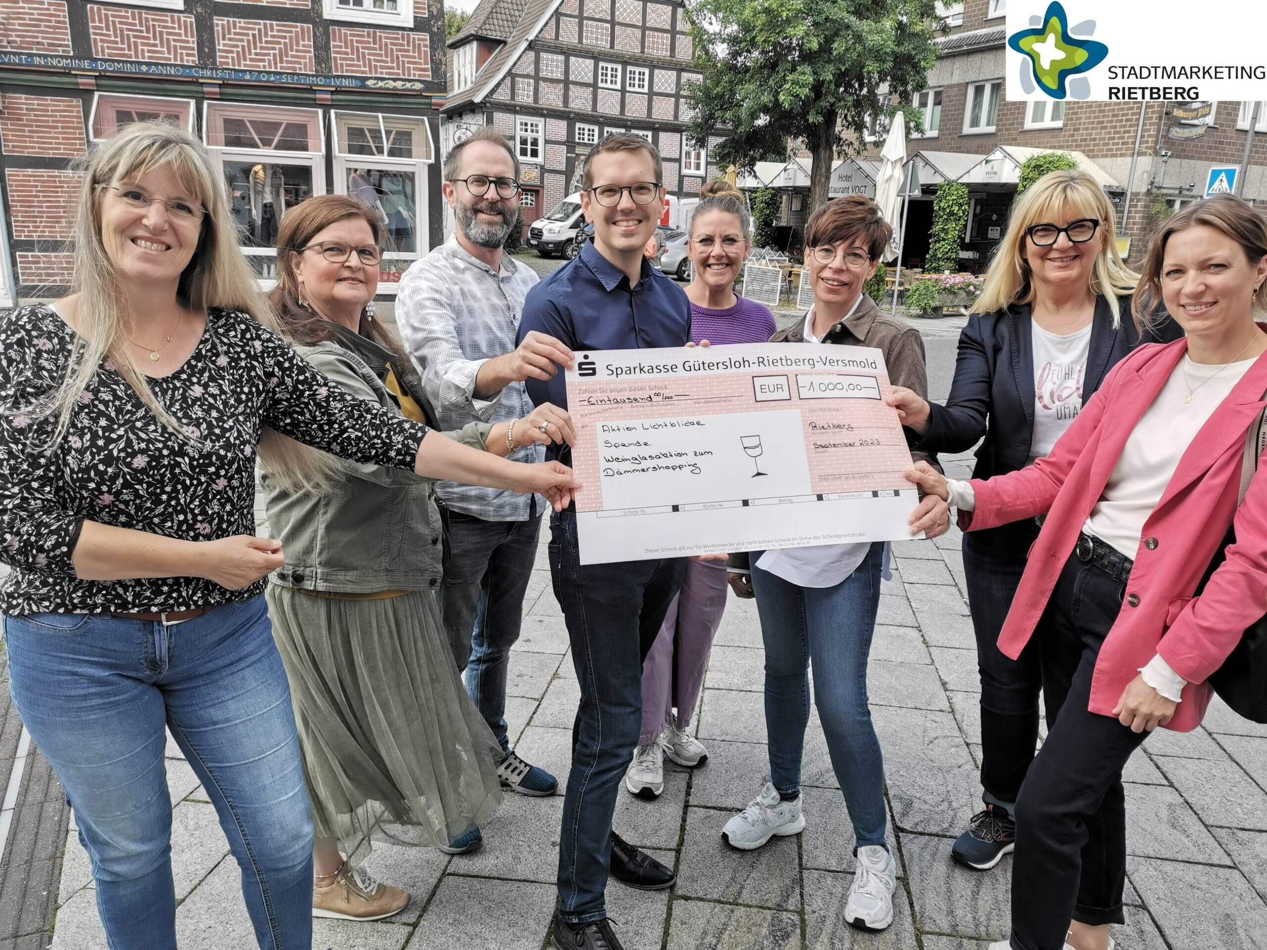 Rietberg. Ein „Weingenuss in Rietberg“-Weinglas kaufen und sich dieses bei teilnehmenden Händlern immer wieder gegen eine Spende befüllen lassen – dieses Angebot nutzten bei den drei zurückliegenden Dämmershopping-Abenden in diesem Sommer zahlreiche Besucher und ließen sich einen leckeren, kühlen Tropfen schmecken. Das Geld, das für den Weingenuss gespendet wurde, kommt nun der Aktion Lichtblicke zugute. 900,82 Euro waren nach den drei Freitagen mit verlängertem Shopping-Vergnügen in den Spendendosen gelandet. Diese Summe stockte Stadtmarketing-Geschäftsführer Johannes Wiethoff auf runde 1000 Euro auf. Das Geld kommt Familien in Nordrhein-Westfalen zugute, die unverschuldet in Not geraten sind.