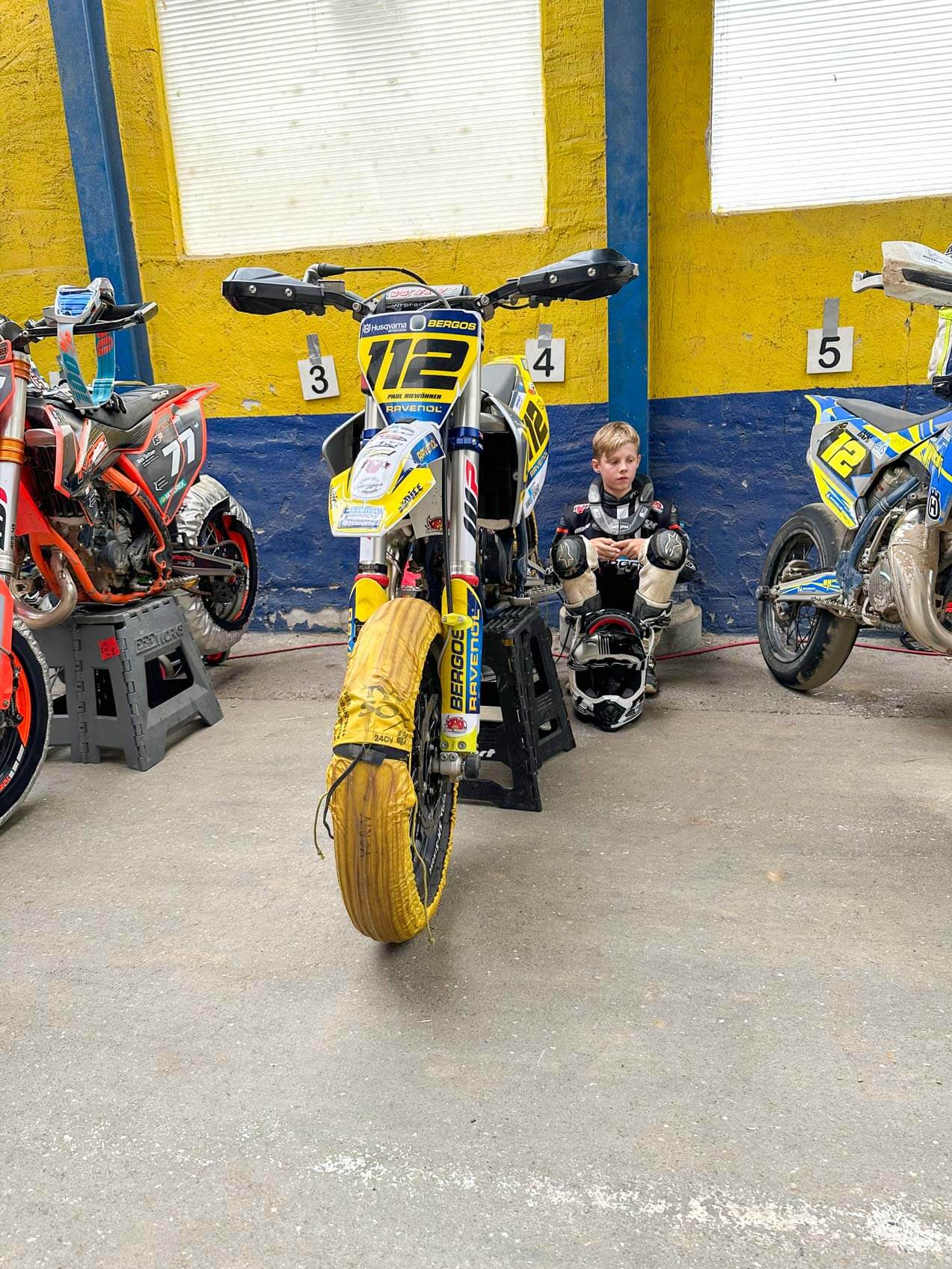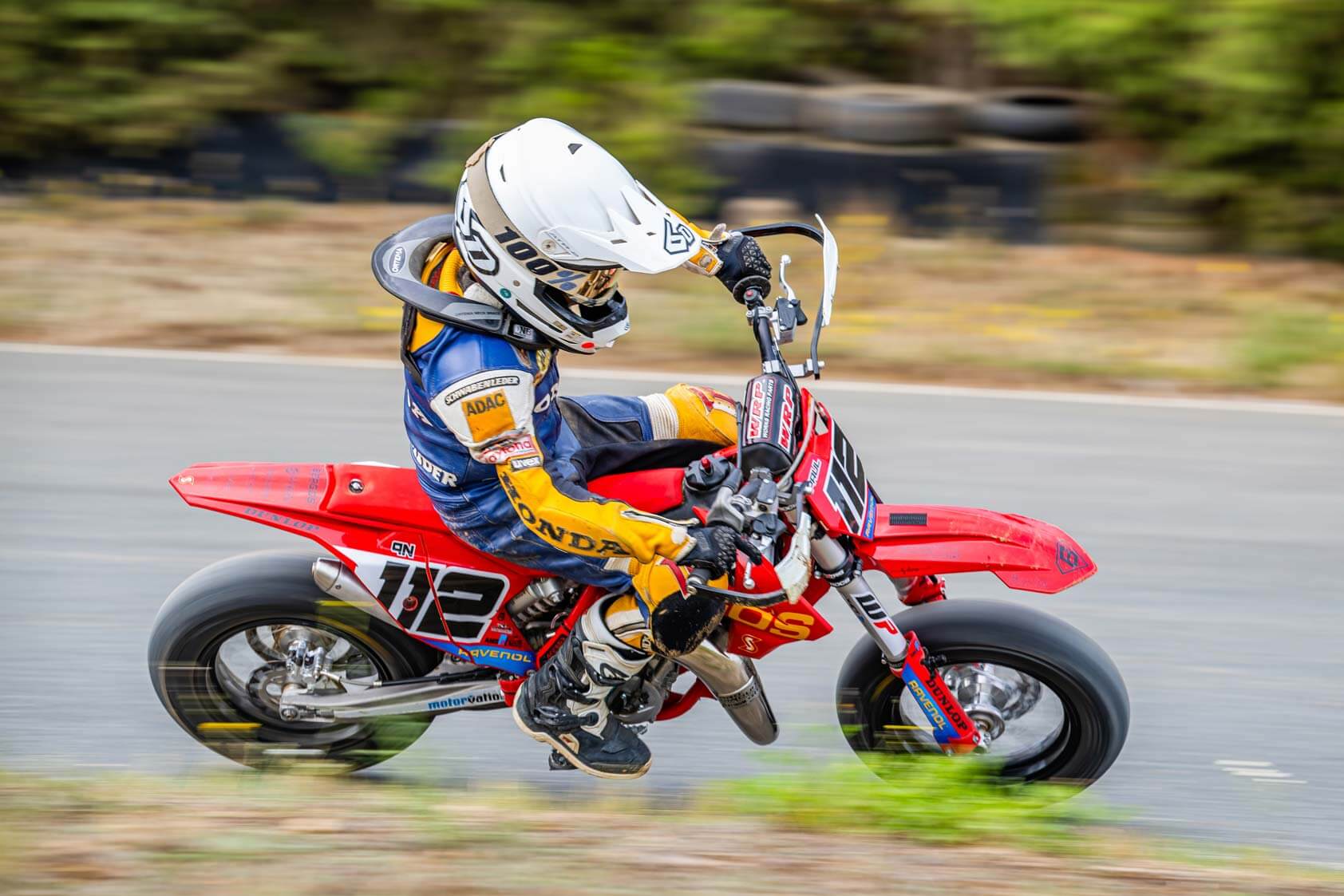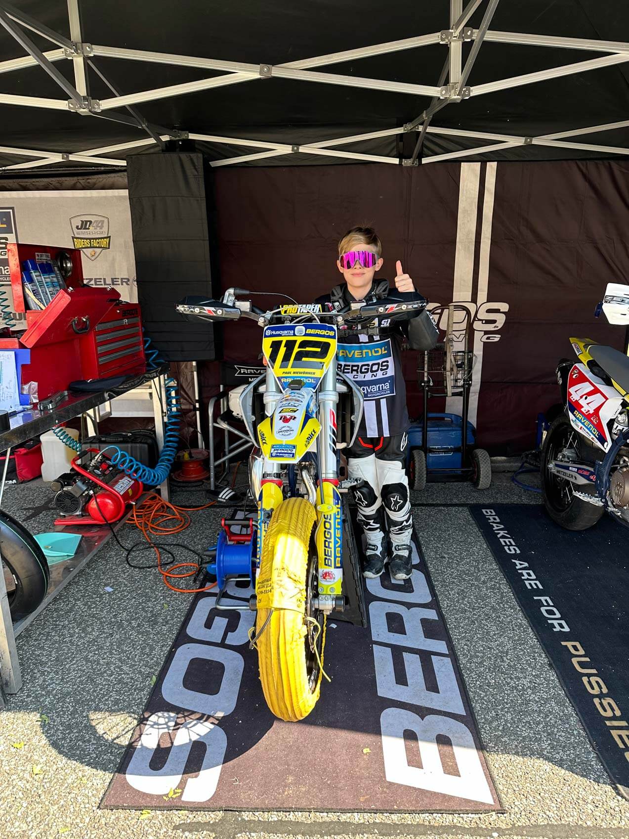 Paul, als Motocross Fahrer mehr an rutschigen Untergrund gewöhnt, konnte sich schnell den neuen Gegebenheiten anpassen. In einem spontanen Test in der deutschen Supermoto Meisterschaft fuhr der damals 9-jährige auf der Kartbahn in Wittgenborn direkt zweimal auf Platz 3, sehr zur Freude seines Vaters André, der selbst mal im Supermoto Fahrerlager aktiv und seit 1998 im Team von Axel „BERGO“ Bergfeld unterwegs ist. Seine Lernkurve ging in seiner ersten vollen Supermoto Saison im Jahr 2022 steil nach oben. Paul wurde kurzzeitig sogar Meisterschaftsführender, mit einem kleinen Flüchtigkeitsfehler im vorletzten Rennen der Saison mit nur 2 Punkten Rückstand deutscher Vizemeister. Erste Erfahrungen in der nächsthöheren Klasse sammelte Paul in diesem Jahr, auf einer von Papa für den Supermoto Sport neu aufgebauten Husqvarna TC 85. Teamintern beobachtet der Supermoto Profi und zweifache deutsche Supermoto Meister Jan Deitenbach Pauls Entwicklung und gibt wertvolle Tipps.