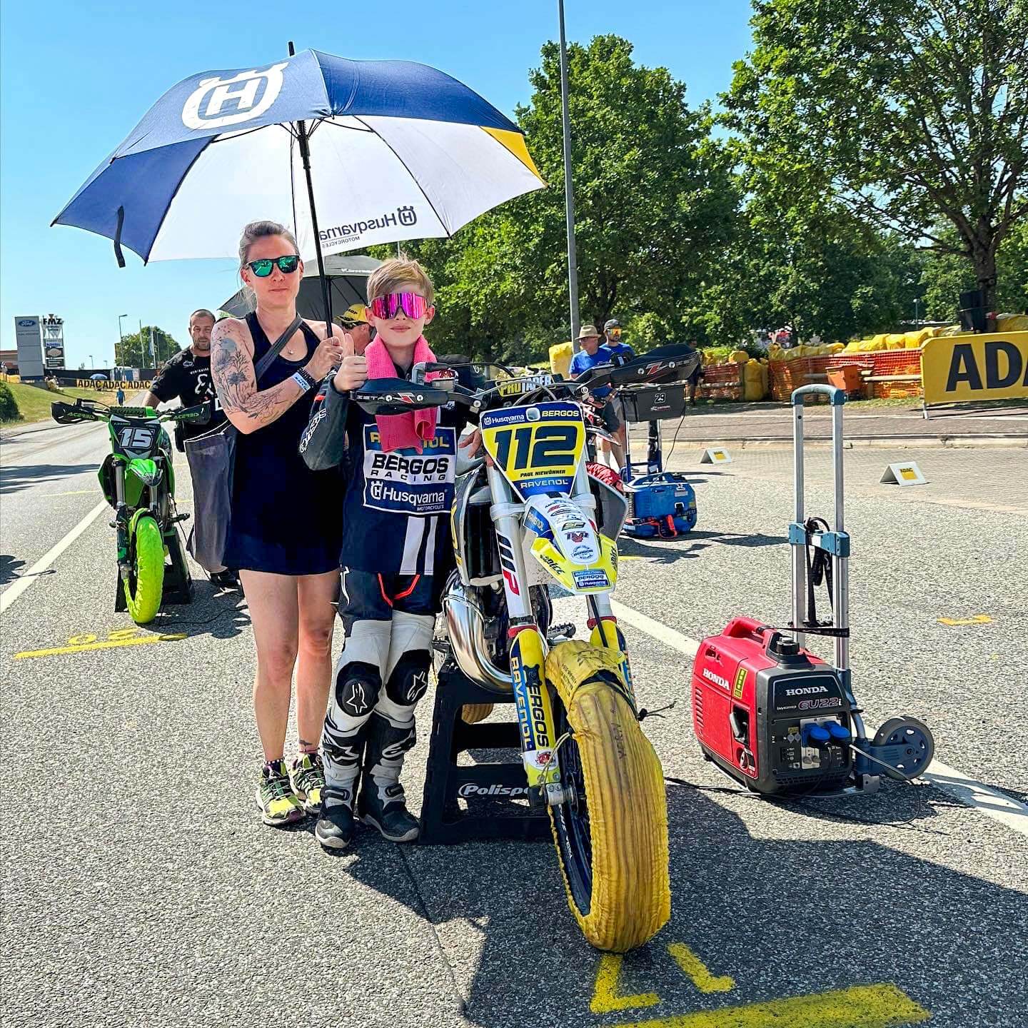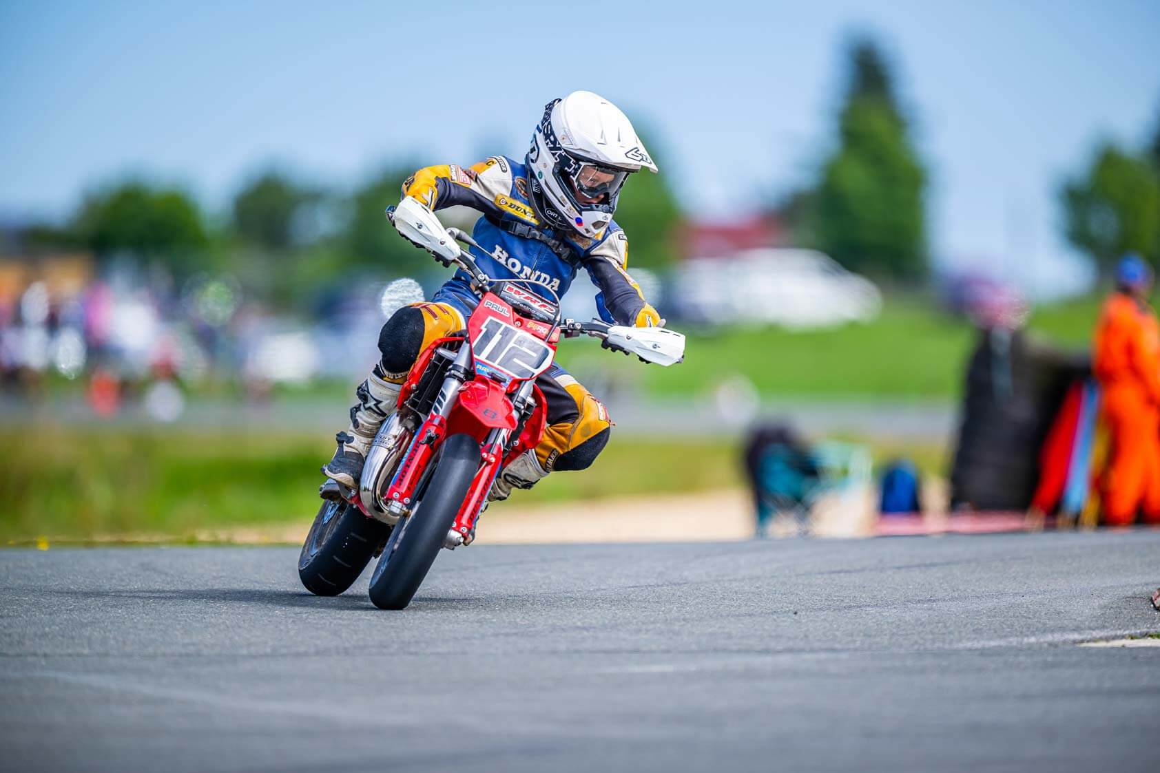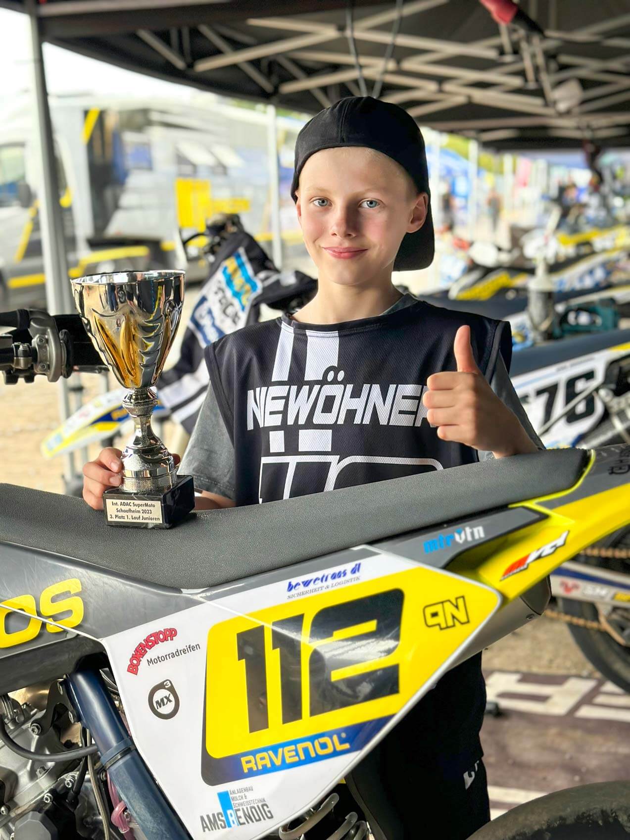 Paul, als Motocross Fahrer mehr an rutschigen Untergrund gewöhnt, konnte sich schnell den neuen Gegebenheiten anpassen. In einem spontanen Test in der deutschen Supermoto Meisterschaft fuhr der damals 9-jährige auf der Kartbahn in Wittgenborn direkt zweimal auf Platz 3, sehr zur Freude seines Vaters André, der selbst mal im Supermoto Fahrerlager aktiv und seit 1998 im Team von Axel „BERGO“ Bergfeld unterwegs ist. Seine Lernkurve ging in seiner ersten vollen Supermoto Saison im Jahr 2022 steil nach oben. Paul wurde kurzzeitig sogar Meisterschaftsführender, mit einem kleinen Flüchtigkeitsfehler im vorletzten Rennen der Saison mit nur 2 Punkten Rückstand deutscher Vizemeister. Erste Erfahrungen in der nächsthöheren Klasse sammelte Paul in diesem Jahr, auf einer von Papa für den Supermoto Sport neu aufgebauten Husqvarna TC 85. Teamintern beobachtet der Supermoto Profi und zweifache deutsche Supermoto Meister Jan Deitenbach Pauls Entwicklung und gibt wertvolle Tipps.