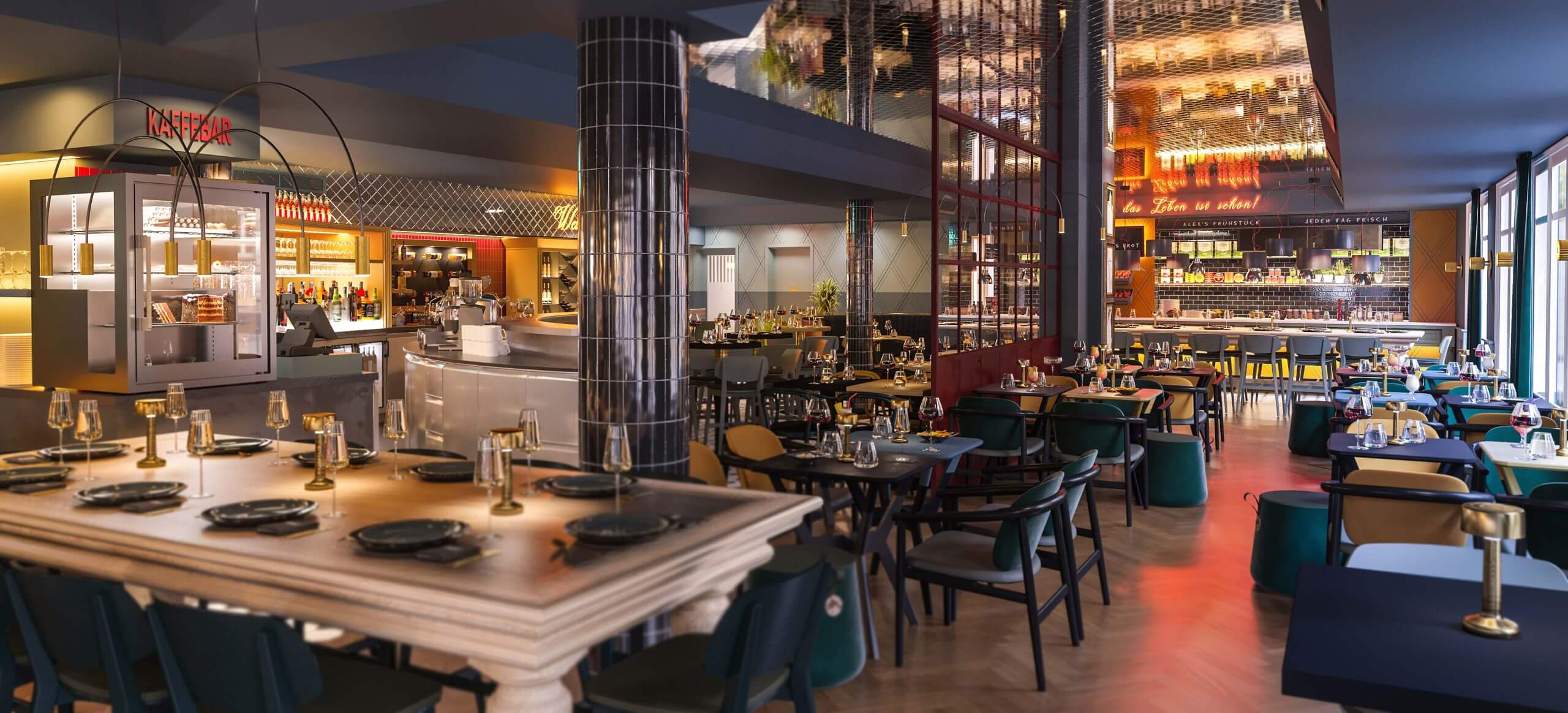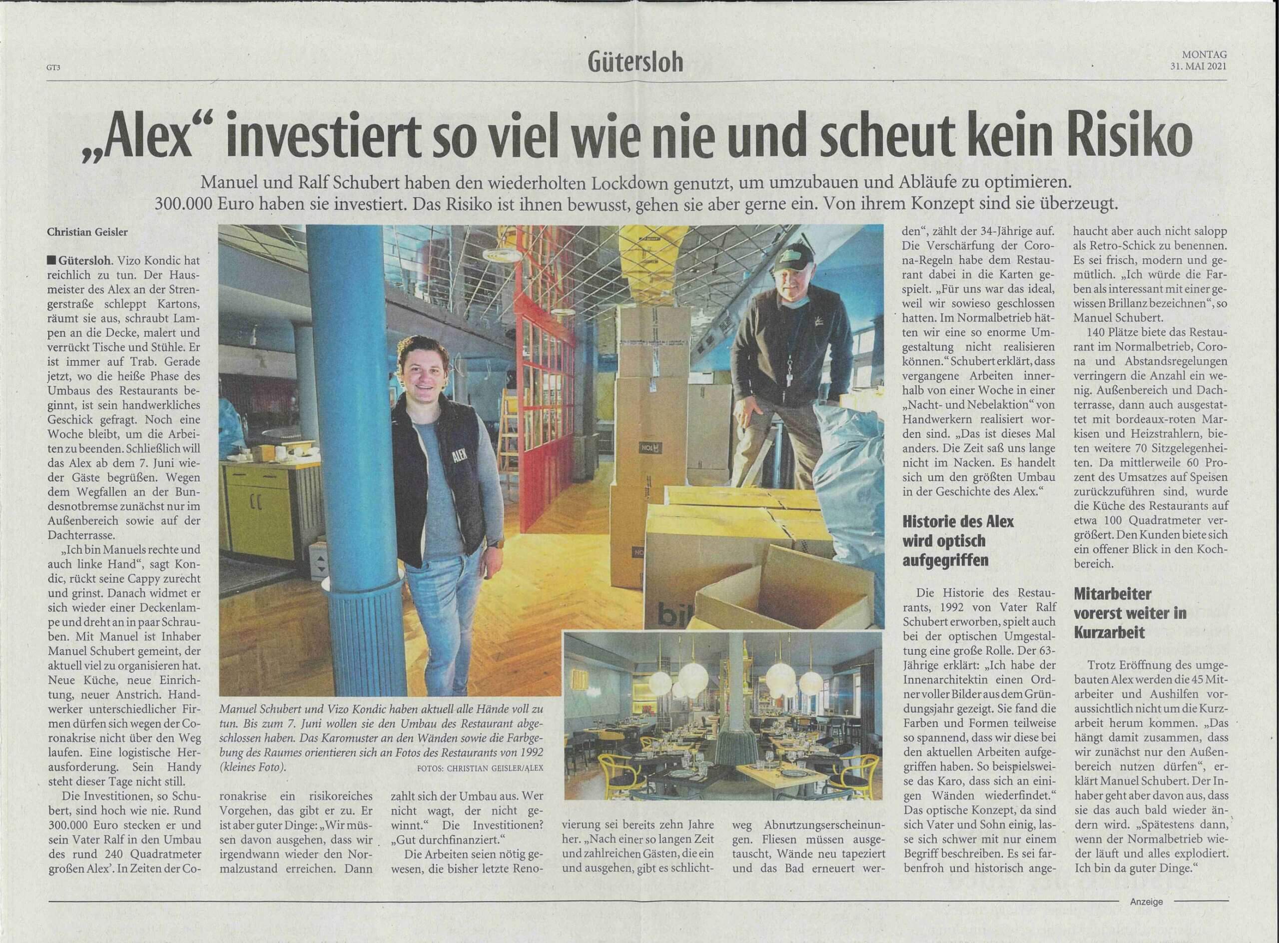 Wer Ralf Schubert kennt weiß, dass er nie stehen bleibt, und so hat er im Laufe der Zeit zahlreiche Umbauten vorgenommen, die dem Zeitgeist entsprechen und den Lifestyle in Gütersloh mitprägen. Zuletzt hat er zusammen mit seinem Sohn Manuel Schubert, der das ALEX heute eigenverantwortlich leitet, einen Komplettumbau vollzogen, welcher nochmal eine große Schüppe »Zeitgeist on top« obendrauf legt. Mit einem Hauch von Retro, kombiniert mit modern New York Bistro Style, wurde so in Gütersloh eine einzigartiges ALEX geschaffen, das es so nur ein einziges Mal gibt. Mit einem Blick auf die vergrößerte Frontcooking-Küche und einer Bar, die nur so vor Lebendigkeit und Fortschritt trotzt, fühlen wir uns in diesem coolen Ambiente wirklich mittendrin statt nur dabei. Wir freuen uns auf einen frisch, mit Liebe gemixten Cocktail und leckere Köstlichkeiten aus der Küche. Das Auge isst ja bekanntlich mit!