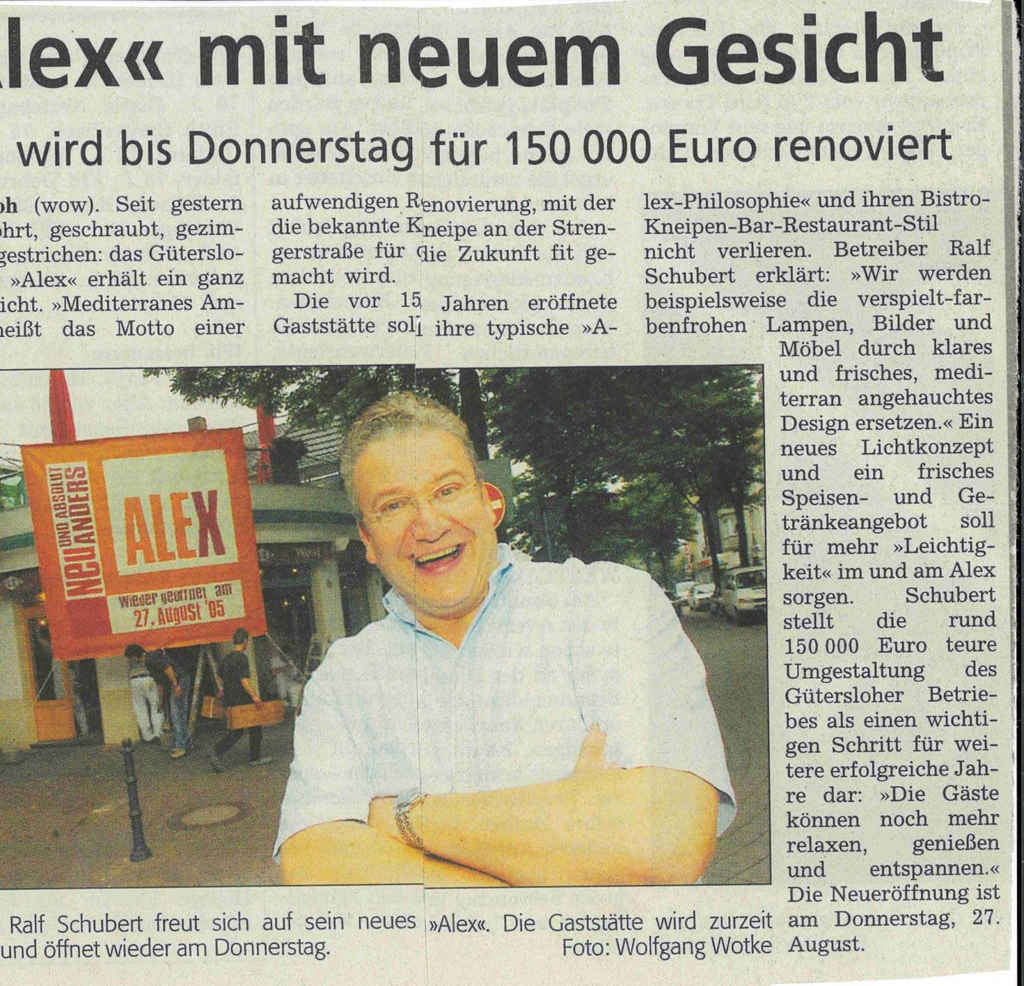 Wer kennt sie nicht, die 90er Jahre, als Neonfarben und Schulterpolster die Szene dominierten. In dieser verrückten Zeit eröffnet Ralf Schubert das ALEX in Gütersloh. Niemand konnte damals ahnen, welch spannendes Abenteuer auf die Gastronomieszene zukommen sollte. Mit einer Vision, angetrieben von Gastfreundschaft, Innovationen und dem Blick für das Wesentliche, wurde 1993 der Grundstein für das Kult-Restaurant gelegt, welches heute nicht mehr wegzudenken ist. Von den ersten Tapeten, über die Ausstattung, bis zur Auswahl von Getränken und Speisen – jedes Detail wurde mit Sorgfalt ausgewählt, um ein Erlebnis zu schaffen, das die Gastronomieszene bis heute prägt. Trendmäßig immer ganz weit vorne – so zeigt sich das Alex Jahr für Jahr. Wir sind übrigens schockverliebt in die coolen Kugel-Deckenlampen aus den Anfängen, die auch dem jetzigen Ambiente einen gelungenen, nostalgischen Touch verleihen.