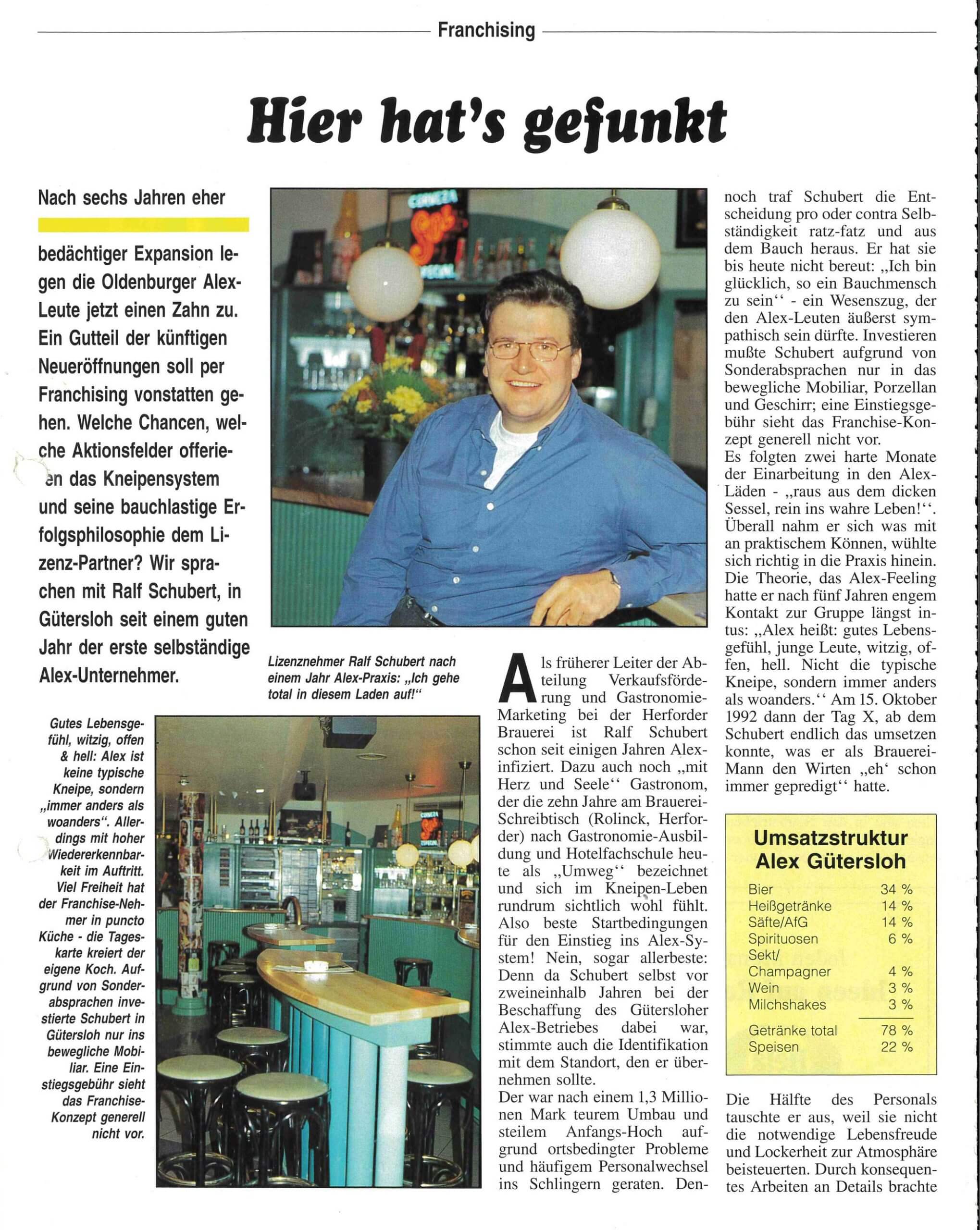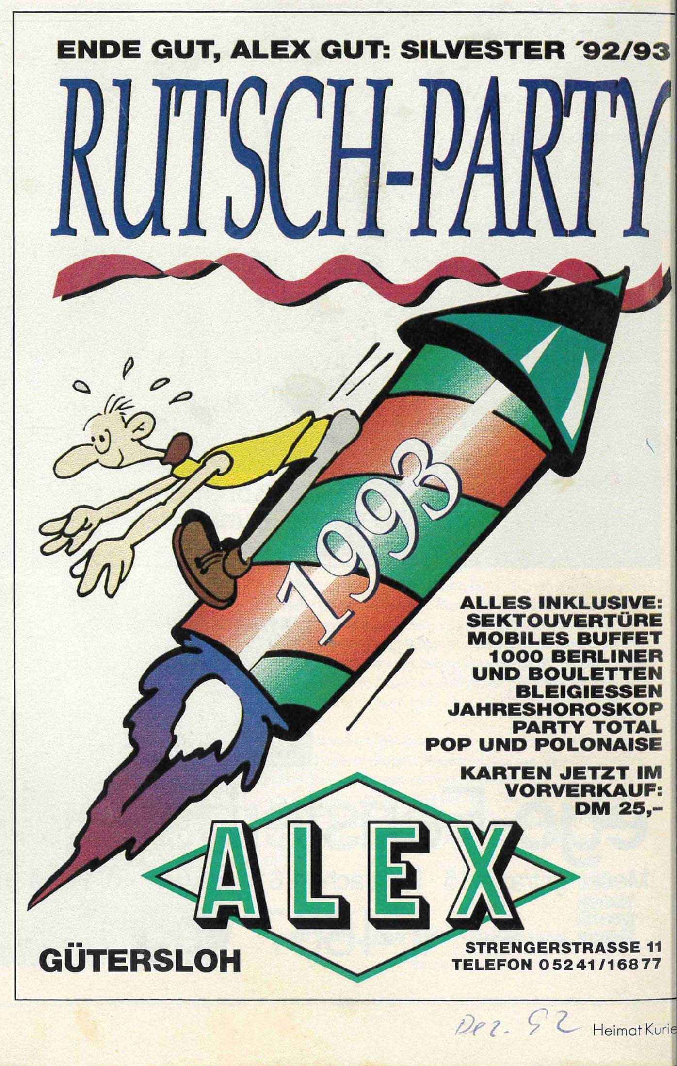 Und wir wollen unbedingt weiter zurückschauen, in die Zeit als Ralf Schubert und sein Team den Güterslohern zeigte, wie man richtig abfeiert. Mit wöchentlichen Soulnight-Partys jeden Mittwochabend und legendären Mottopartys an den Wochenenden entwickelt sich hier in rasanter Geschwindigkeit ein absoluter Kult- und Szeneladen. Mottos wie »Flintstones«, »Maschendraht«, »Titanic« und »The Black Night« sorgten für grandiose Partynächte und wirklich jeder Gast, der Teil dieser Events war, erinnert sich gerne an diese bombastischen Abende zurück. An legendäre Abende, in denen nicht nur gemeinsam gefeiert, getanzt und gelacht wurde. Hier sind neben Freundschaften und Partnerschaften sogar Ehen entstanden, die noch bis heute halten. Die »Rutschparty« 1993 war die erste Silvesterparty im ALEX. Damals ahnte sicher noch keiner, wie viele erfolgreiche Jahre noch folgen würden. Drei Jahrzehnte Kultlokal und ein Ende ist noch lange nicht in Sicht. Da sind wir vom Carl uns ganz sicher!