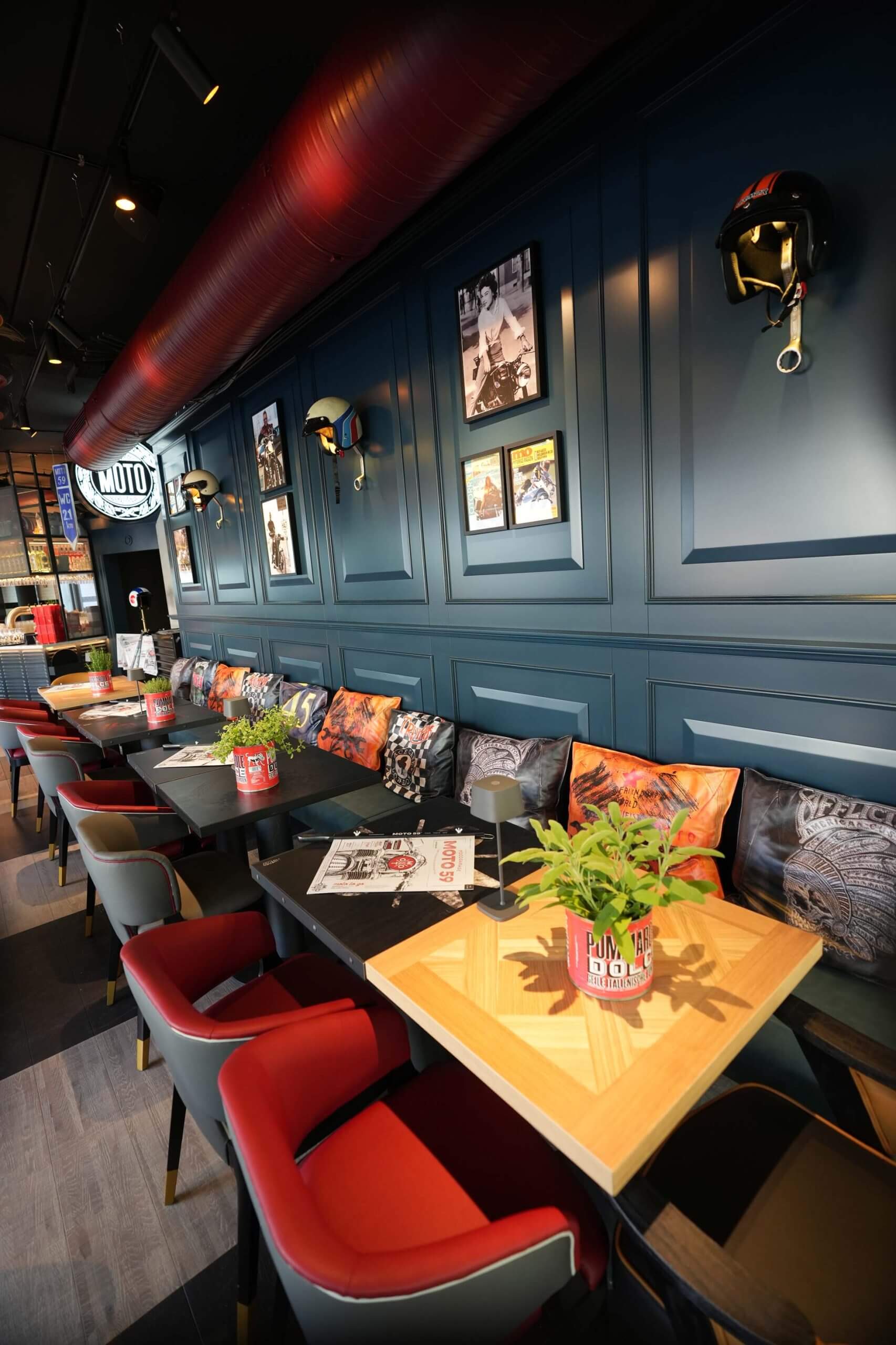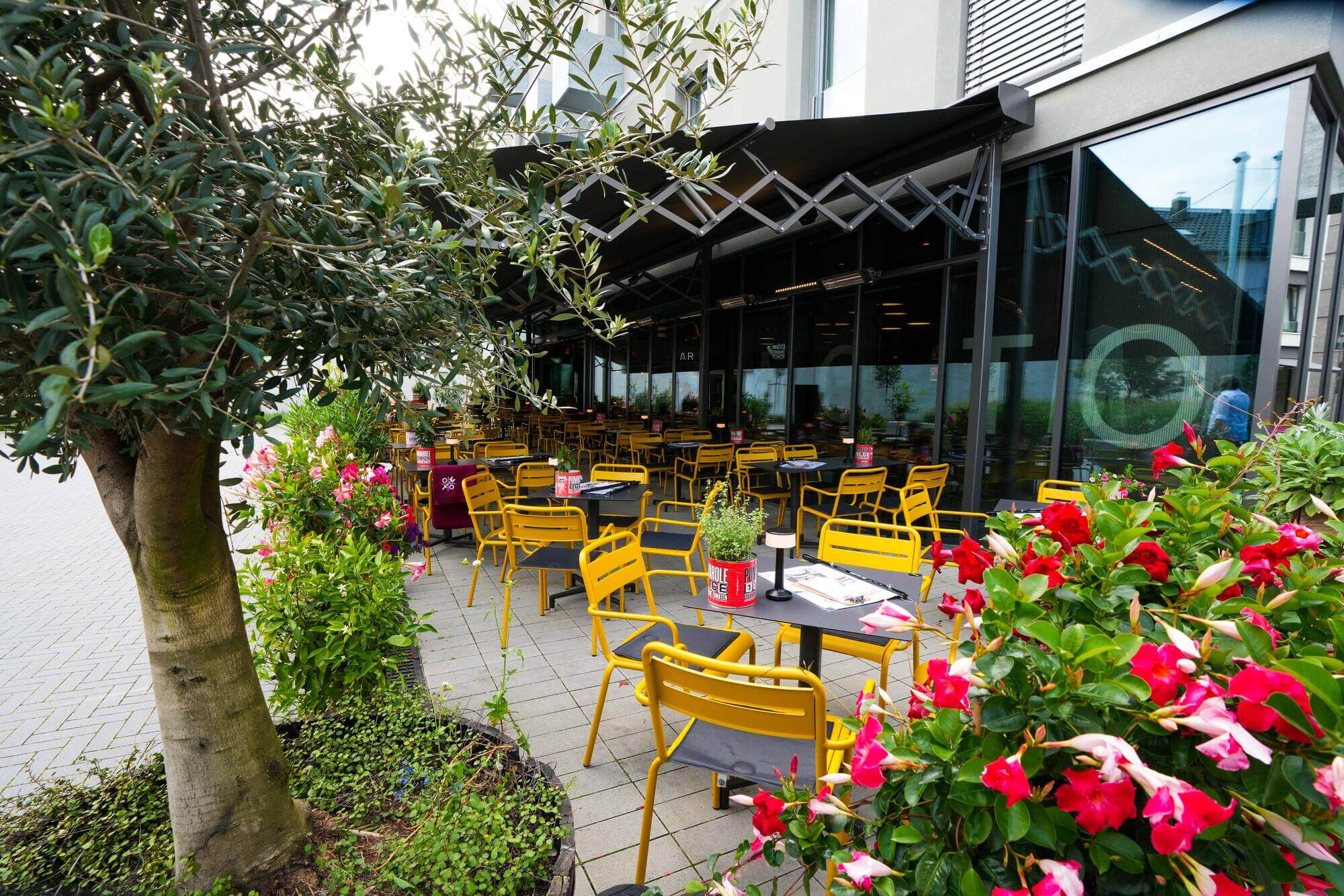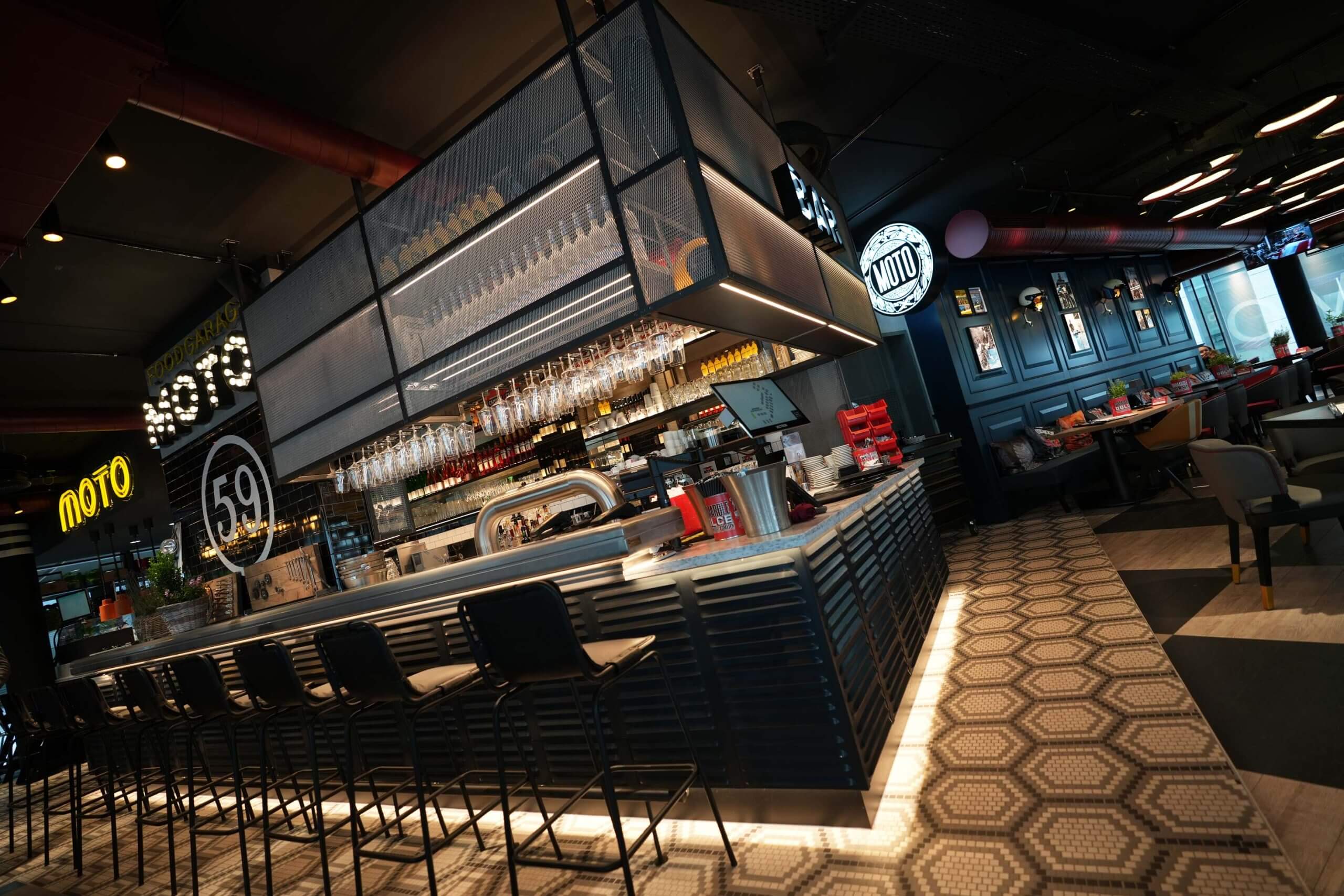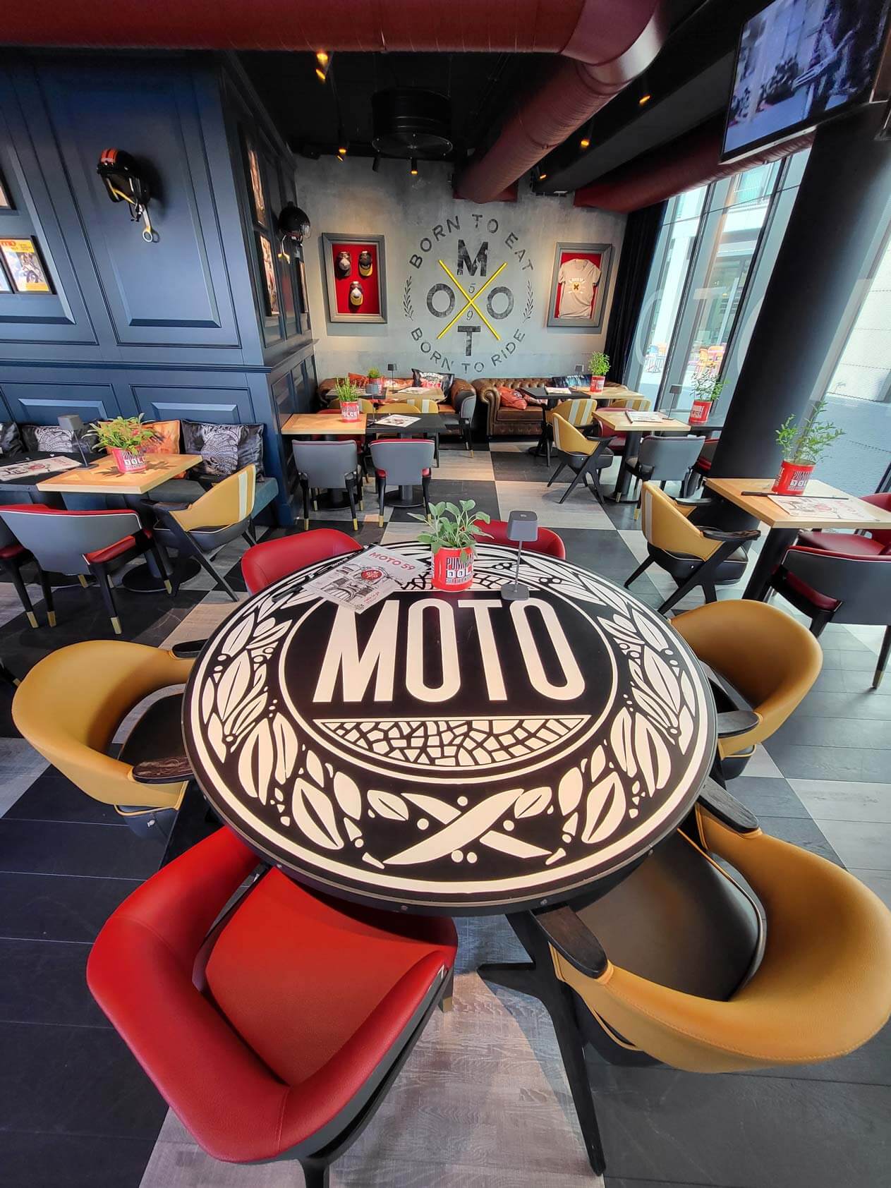 Großartige Veränderungen sind schon jetzt in allen Bereichen zu entdecken. So fällt unser Blick auf die neue, einladende Loungeterrasse vor dem Eingangsbereich, die zusätzlich zu der ruhigen Terrasse im Innenhof errichtet wurde. Wer hier Platz nimmt, sozusagen in der ersten Reihe, genießt sein Gastronomie-Besuch inmitten des lebhaften Stadtfeelings Güterslohs. Das Highlight ist aber die wirklich große einladende Terrasse im Innenhof, inmitten einer kleinen grünen Oase des Kaiserquartiers, welche sogar bei Regen durch eine riesige Markise überdacht wird und den Genuss im Freien in keinster Weise mindert. Sollten alle begehrten Plätze belegt sein, begeistert das Moto59 natürlich auch indoor mit seinem modernen und einzigartigen Garage-Style zum Verweilen und Genießen.