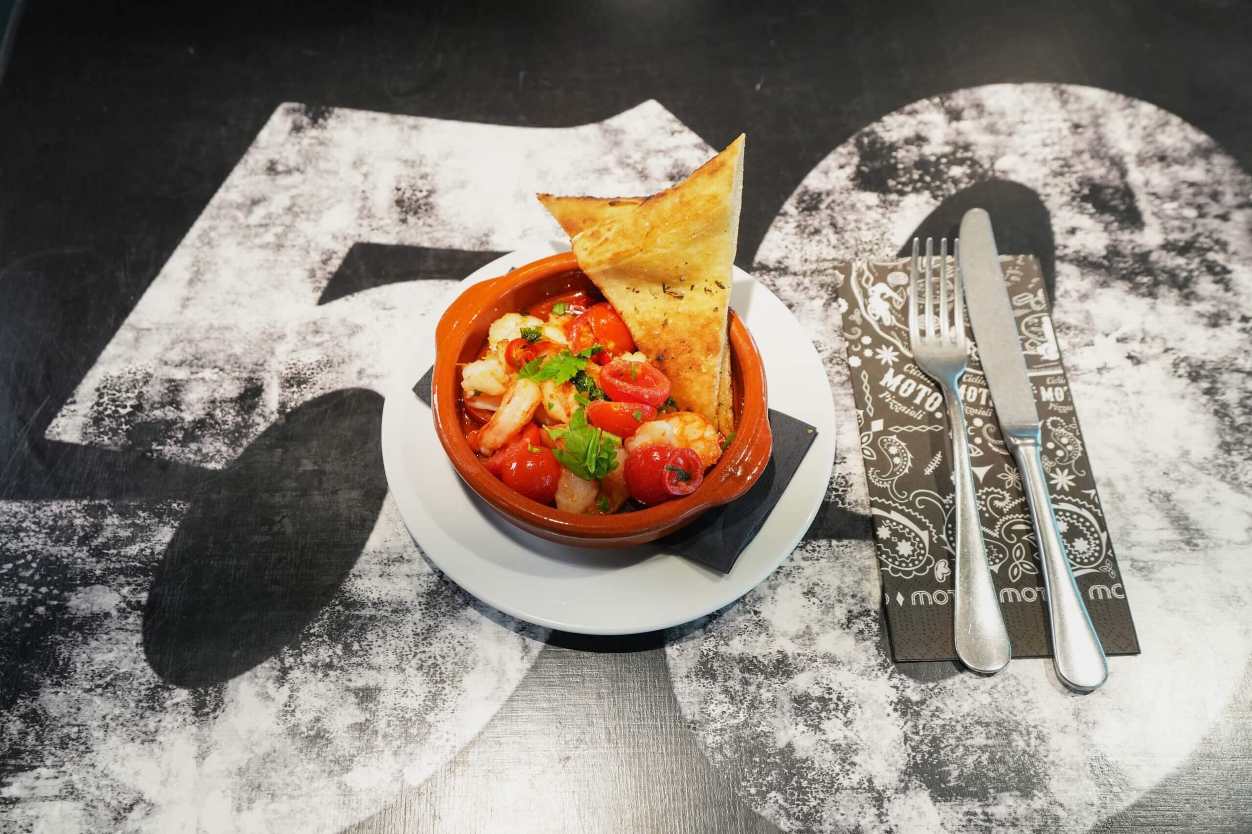 Was wir neu entdecken und mit Begeisterung gleich testen, sind die Piccoli Piatti, die uns als warme Kleinigkeiten serviert werden. Mit Scampi Al Oglio, Datteln Di Pancetta, Patatas Bravas & Co. schweben wir quasi im siebten mediterranen Tapas Himmel – wenn es ihn geben sollte, dann hier im MOTO59. Zum guten Essen rundet ein italienischer Wein, ein Longdrink oder ein kühles Blondes, von der schicken BAR aus serviert, den Genuss in der Foodgarage ab.