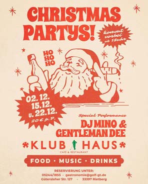 Im Winter finden hier bis zu 120 Personen Platz, aber auch kleinere Gruppen sind willkommen! Vom servierten à la carte Menü bis zum Wunschbuffet ist alles möglich. Freut Euch auch auf die Christmas-Partys an den Sonderterminen. Hier darf nicht nur nach Herzenslust geschlemmt, sondern auch eine heiße Sohle aufs Parkett gelegt werden. Dafür sorgen DJ Mino & Gentleman Dee! Wir sehen uns.